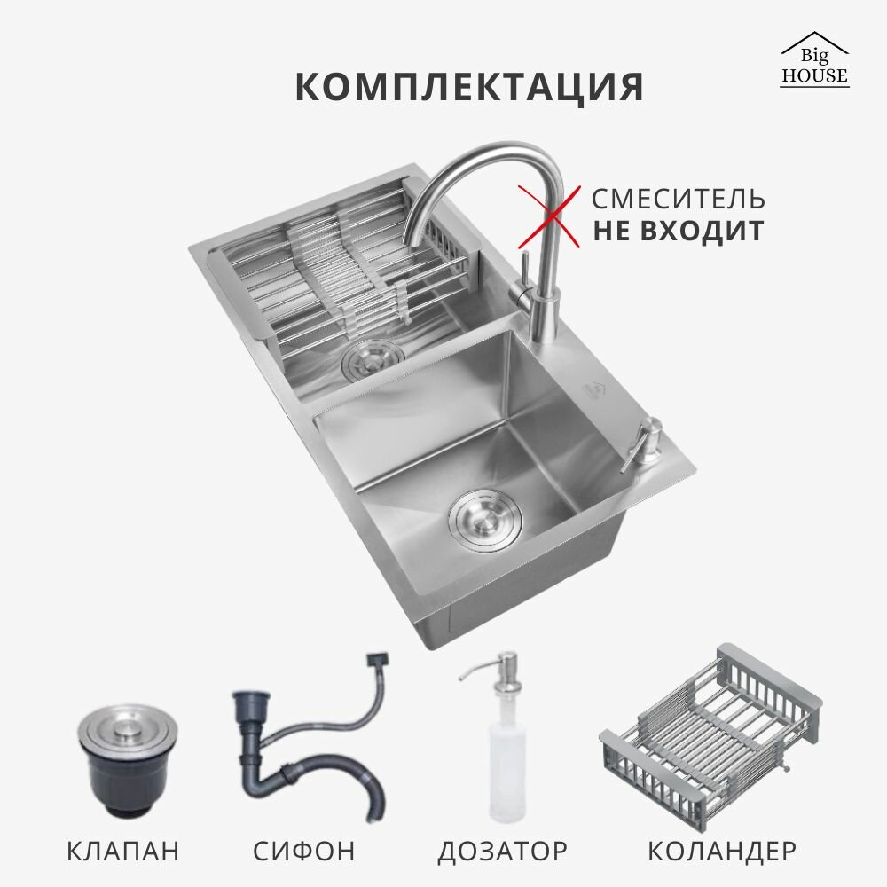 Мойка врезная Big House Двойная 78х43 см, толщина 3,0х0,8 мм, глубина 215 мм, сифон + коландер + дозатор + смеситель