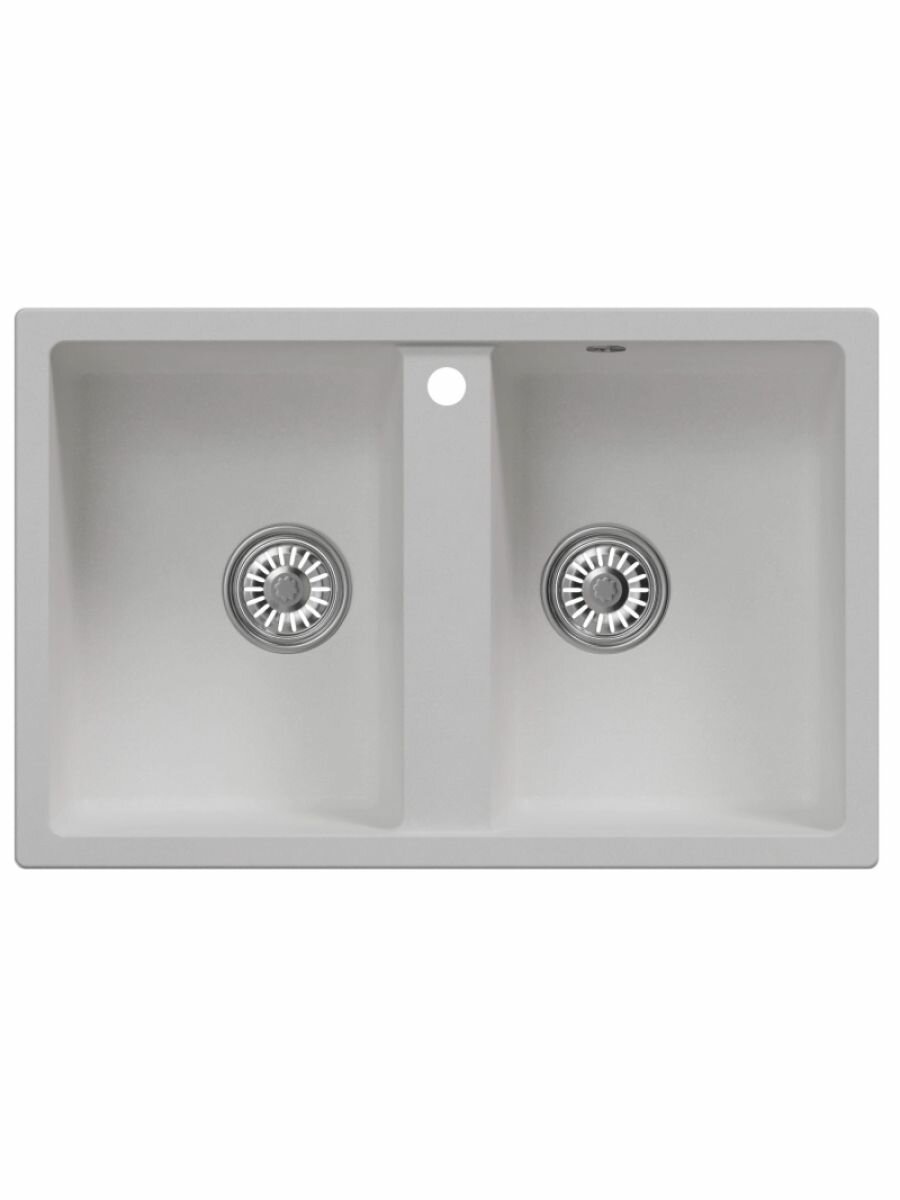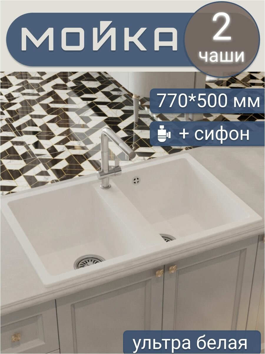 Купить Мойка для кухни врезная прямоугольная, двухчашевая, двойная, из искусственного камня, цвет белый, 770*500*190 мм