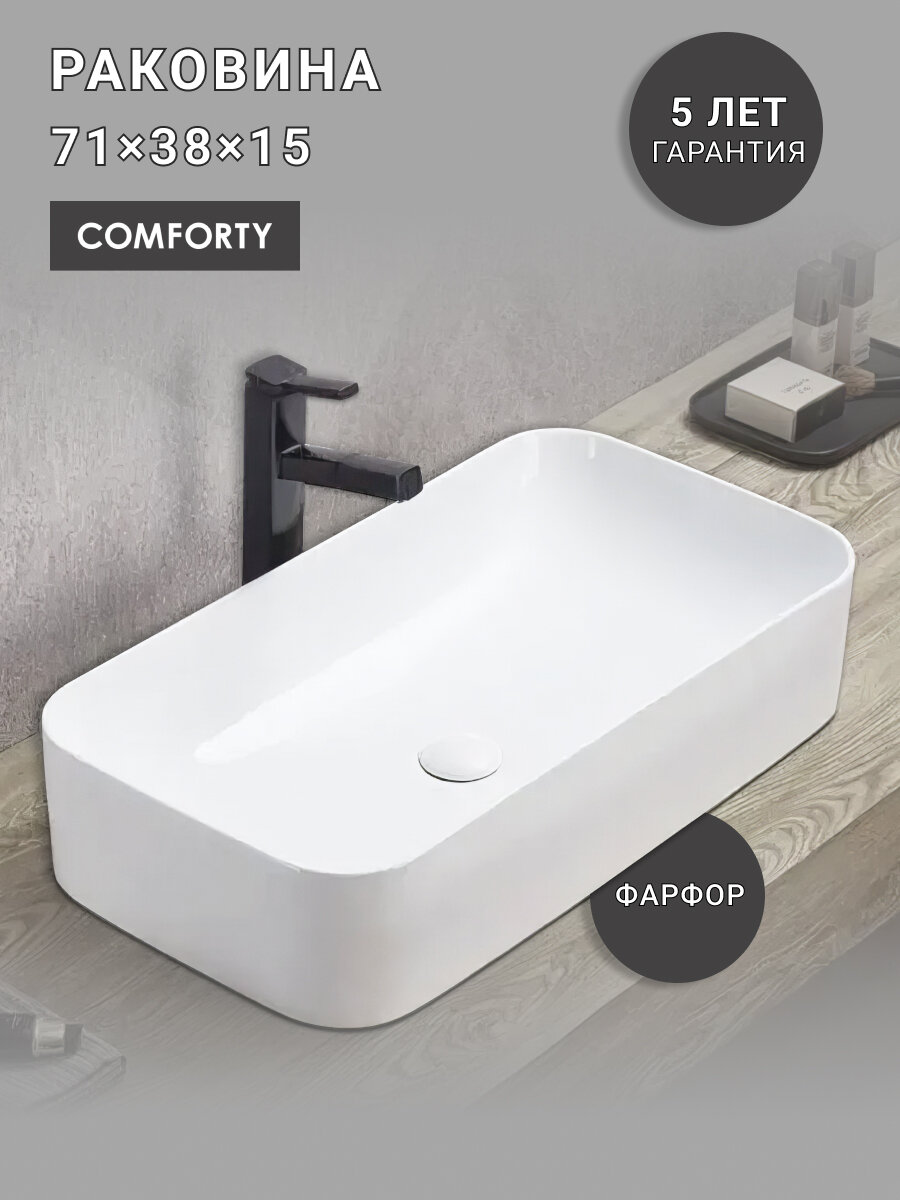 Накладная раковина Comforty 78575-70, прямоугольная форма, белый цвет, 71х38х15см, фарфор интересное: