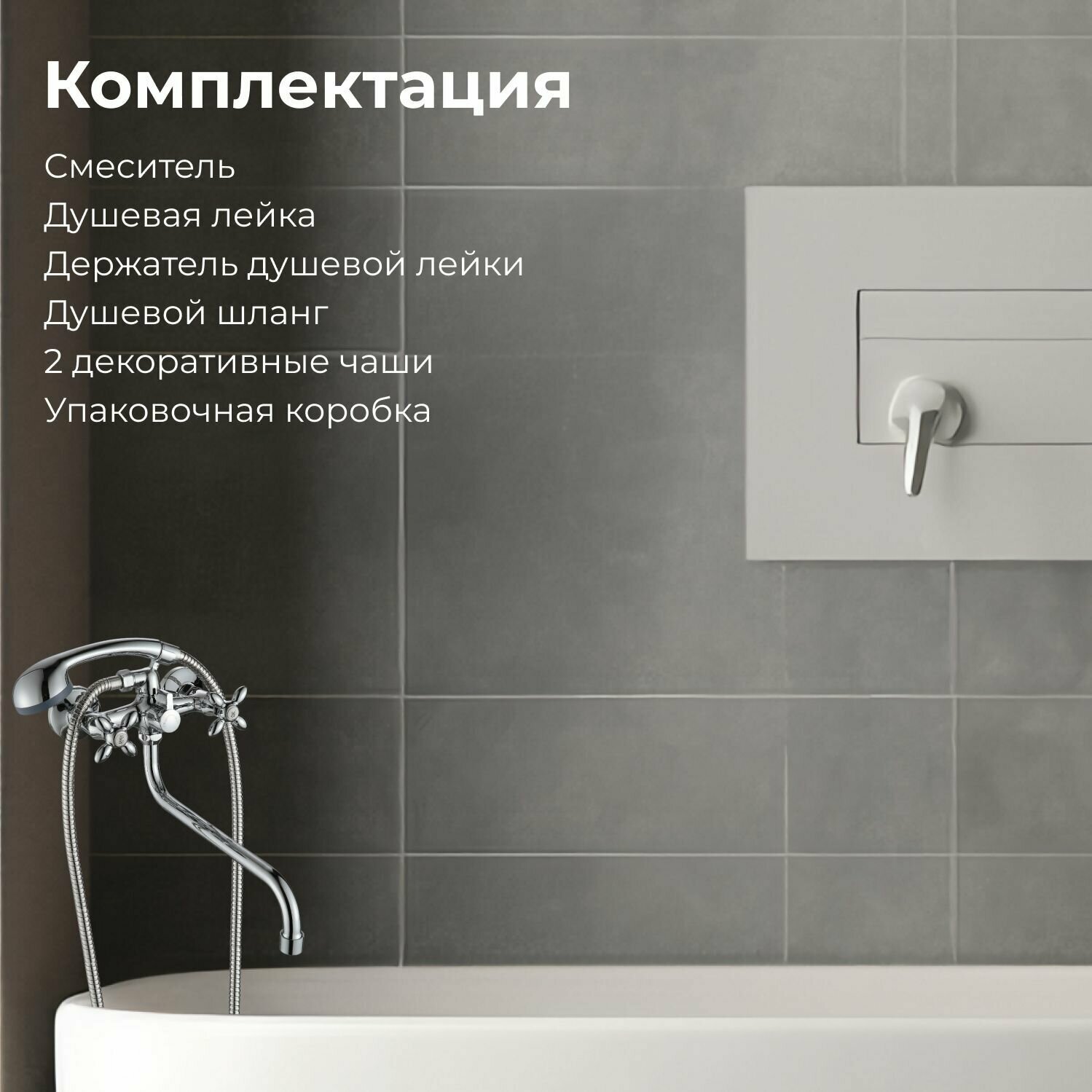 | Комплектация | Душевая лейка; Держатель душевой лейки; Душевой шланг; Смеситель; Декоративная чаша, 2 шт (эксцентриков нет) Гарантийный талон; Упаковочная коробка. |