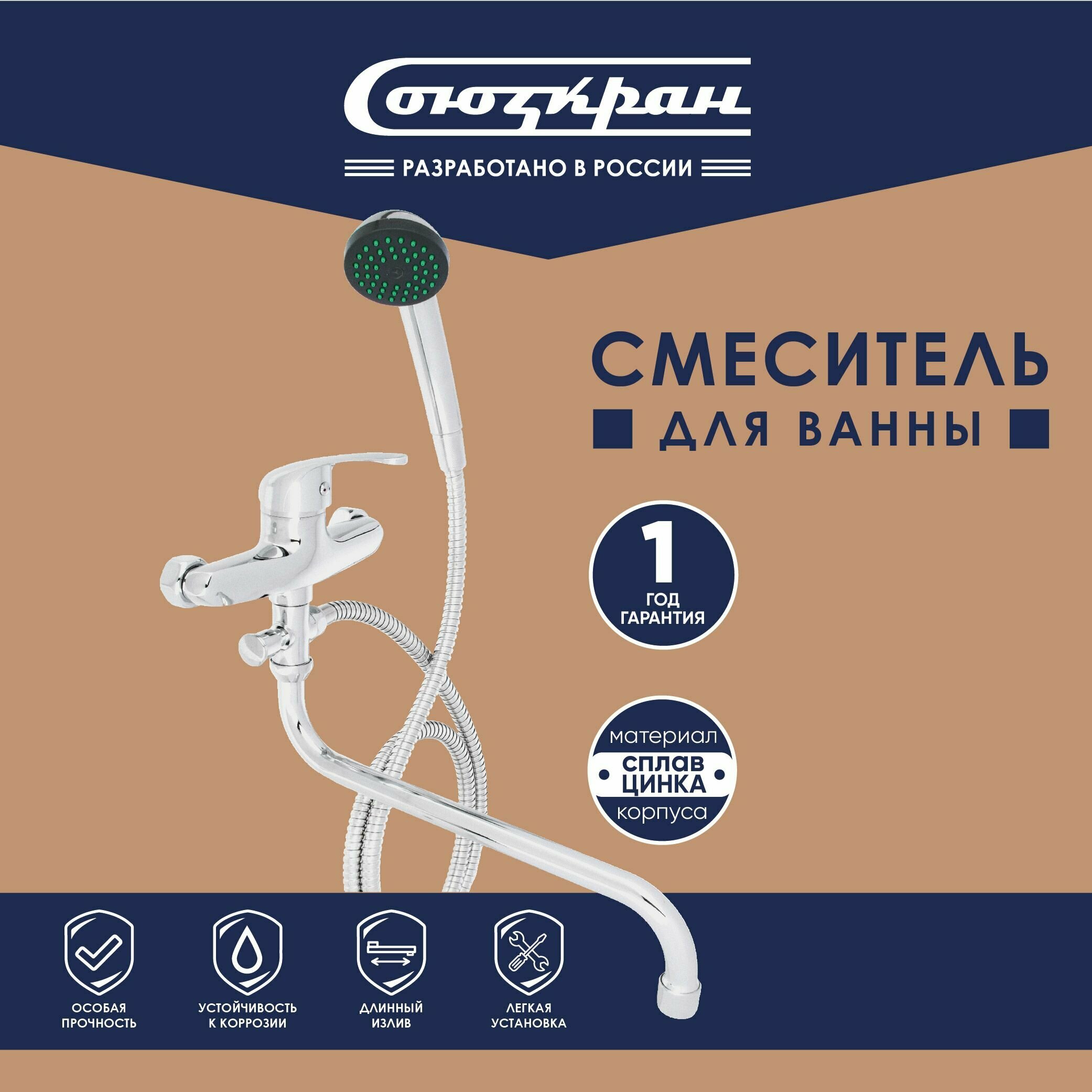 Смеситель для ванны с душем однорычажный СоюзКран, длинный излив, лейка и шланг для душа в комплекте