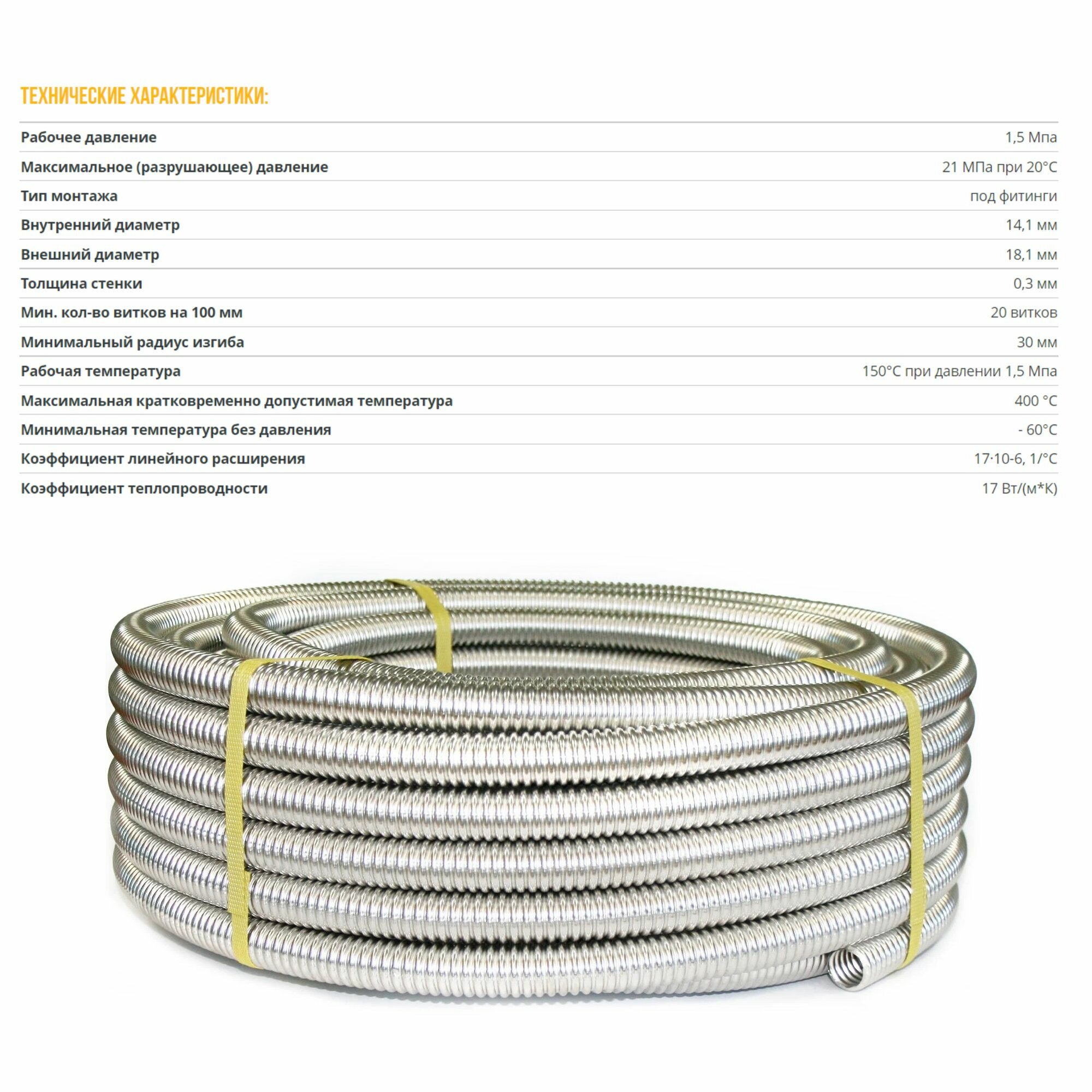 | Дополнительная информация | тип монтажа: под фитинги; максимальная кратковременная температура 400 °C; максимальное (разрушающее) давление 21 МПа при 20°С; коэффициент теплопроводности 17 Вт/(м*К); минимальное количество витков на 100 мм: 18 витков |
