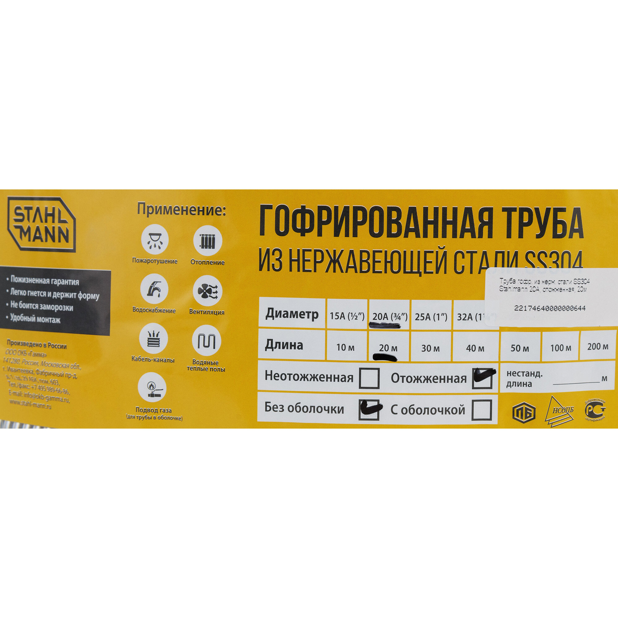 Труба гофрированная водопроводная из нержавеющей стали Stahlmann 20А, отожженная, 50м.