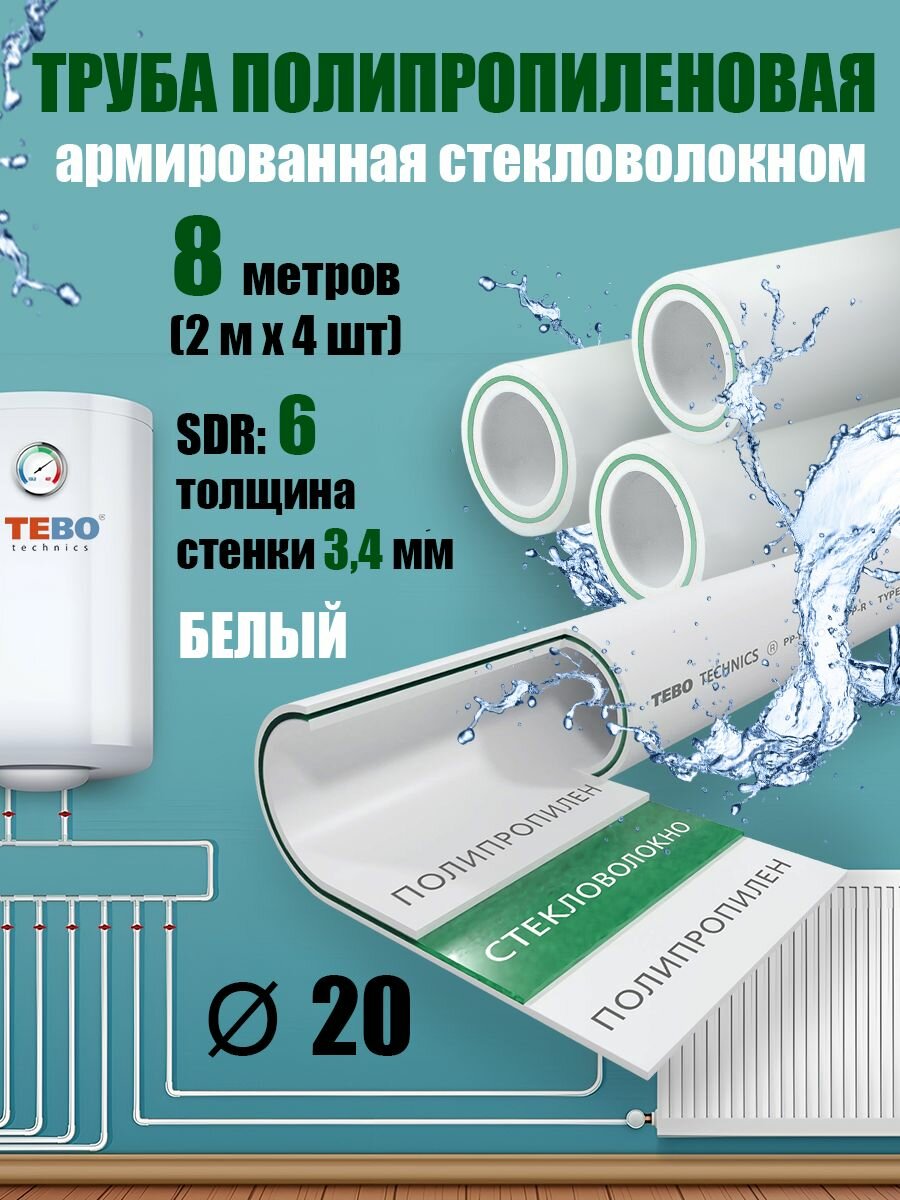 Купить Труба 20 мм полипропиленовая, армированная стекловолокном (для отопления), SDR 6, 8 метров (2 м х 4 шт) / Tebo (белый)