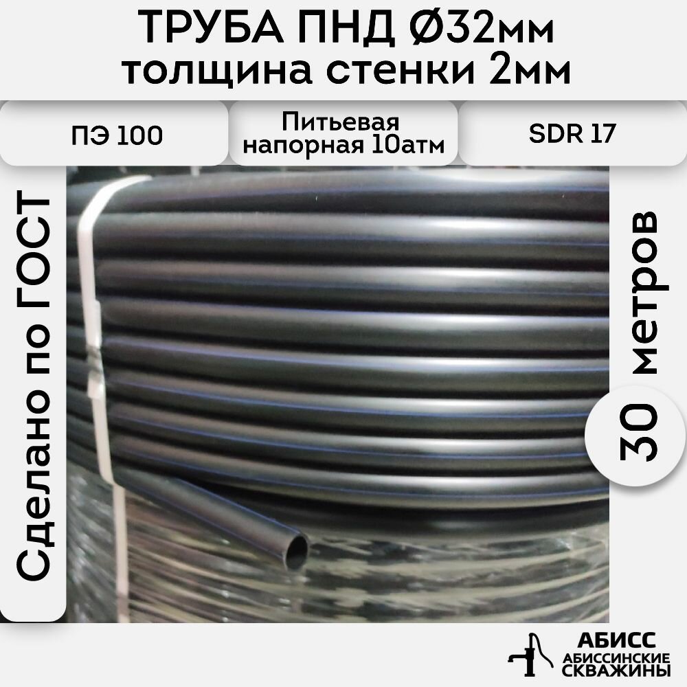 Труба ПНД 32х2. длина 25метров. толщина стенки 2мм. водопроводная питьевая напорная (10атм) ПЭ100, SDR17 ГОСТ18599-2001