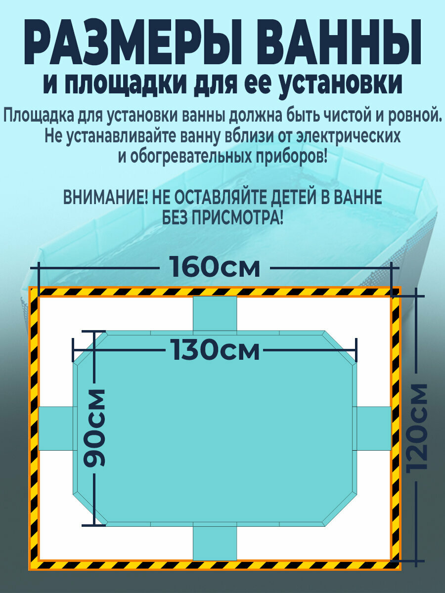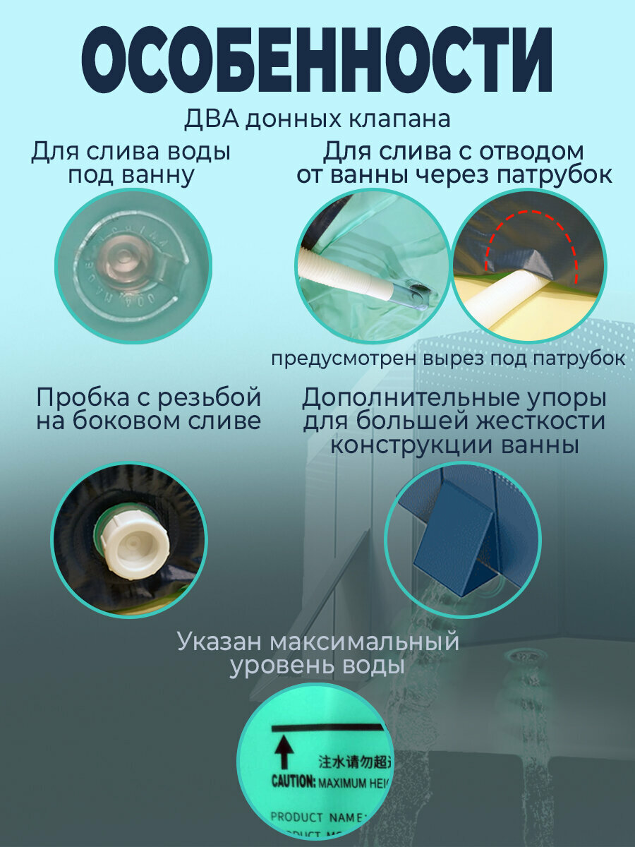 | Дополнительная информация | ванна не требует сборки, поставляется в сборе со складным каркасом; ванна снабжена боковым и донным клапаном для слива воды; рекомендуемый объем наполнения чаши - 2/3 от высоты бортика |