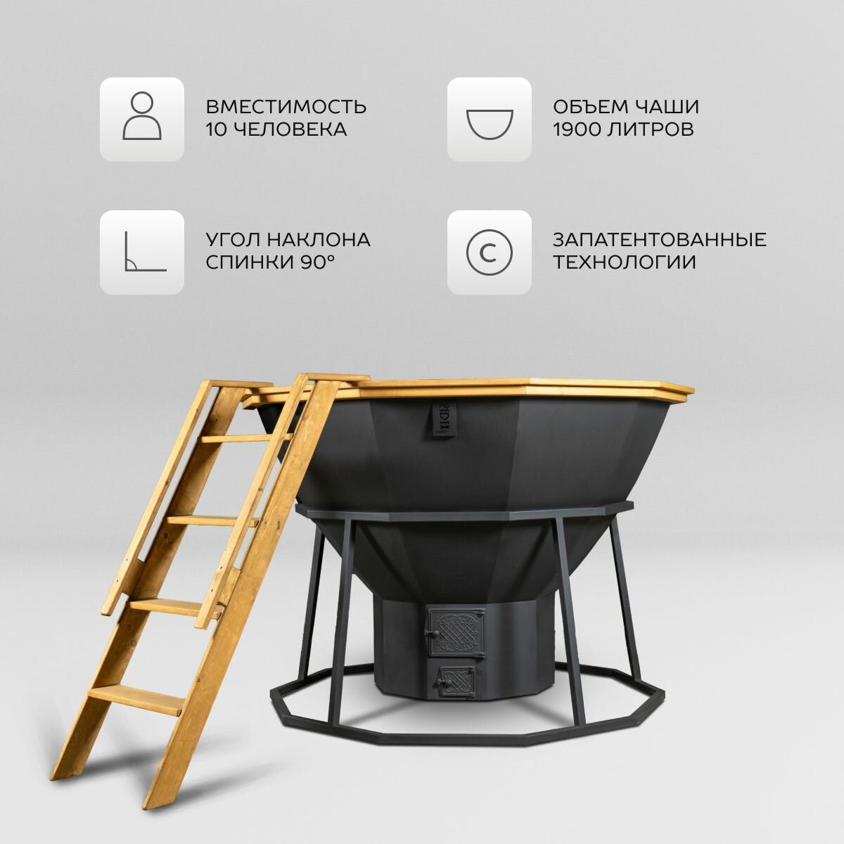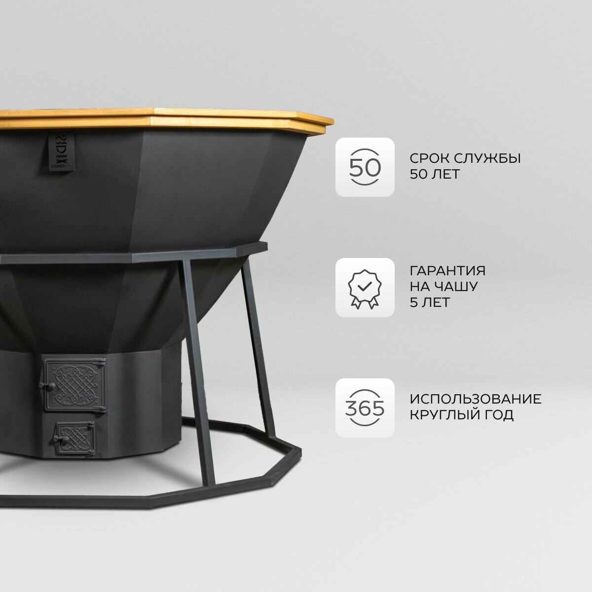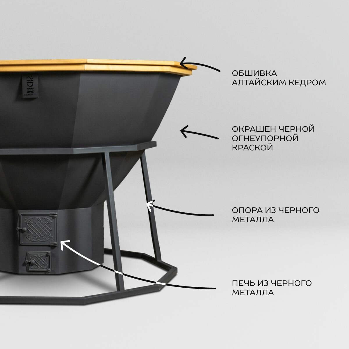 | Подробная комплектация | Чаша из нержавеющей стали AISI 430 толщиной 2 мм - 1 шт., Лестница из алтайского дерева - 1 шт., Опора из черного металла- 1 шт., Печь из черного металла - 1 шт., Дымоход - 1 шт. |