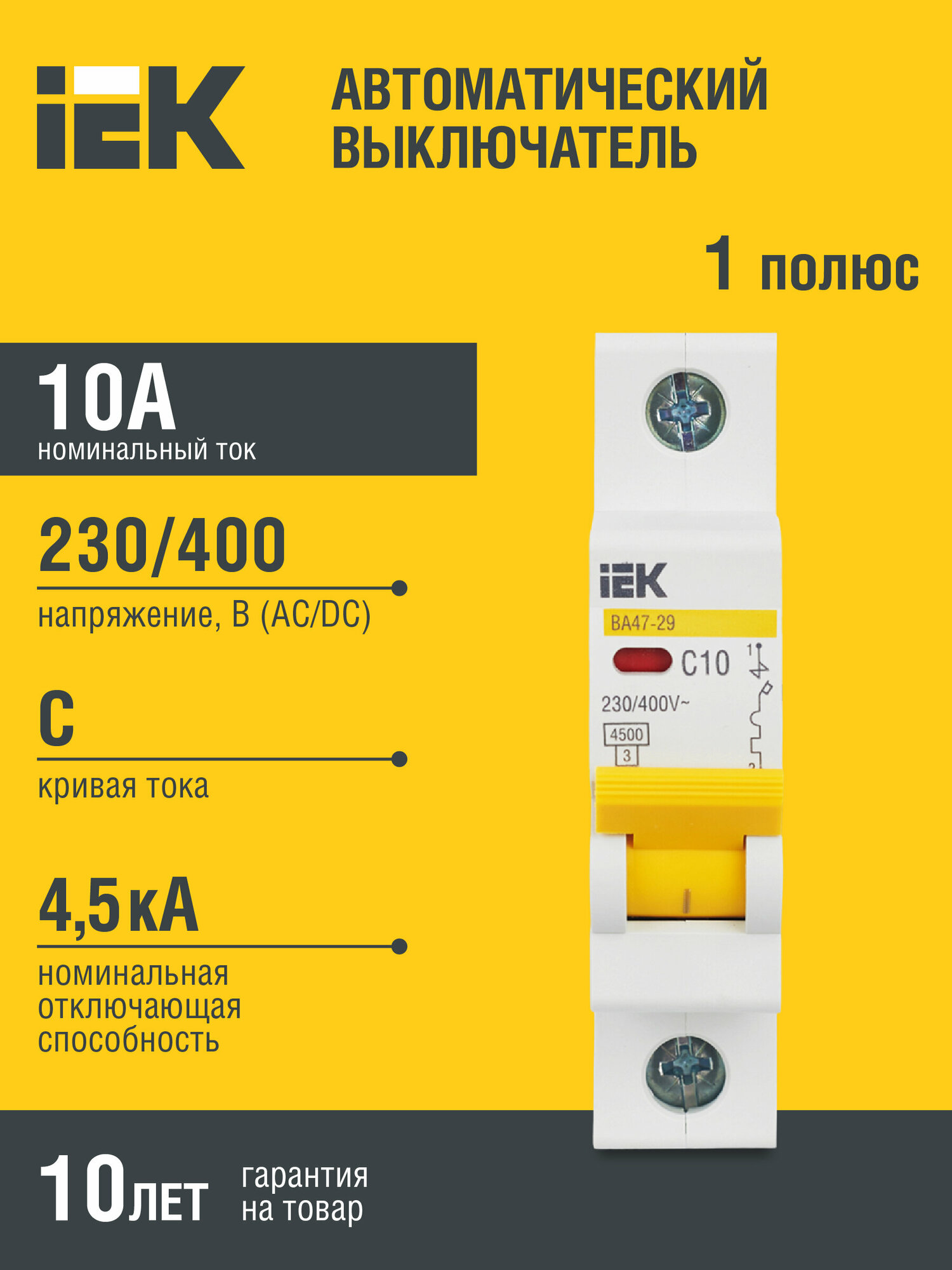 Выключатель автоматический IEK ВА47-29, 1Р, 10 А, 4,5 кА, тип С