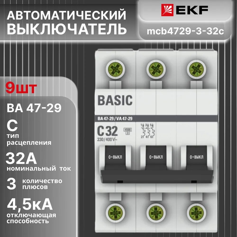 Купить Автоматический выключатель mcb4729-3-32C ВА 47-29 3P 32А 4,5кА, тип C EKF - 9шт