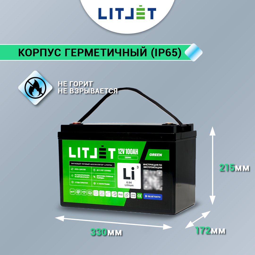 Купить Тяговый аккумулятор LiFePO4 LITJET 12V 100Ah с Bluetooth для ИБП, солнечных электростанций, лодочных моторов, автодомов/прицепов