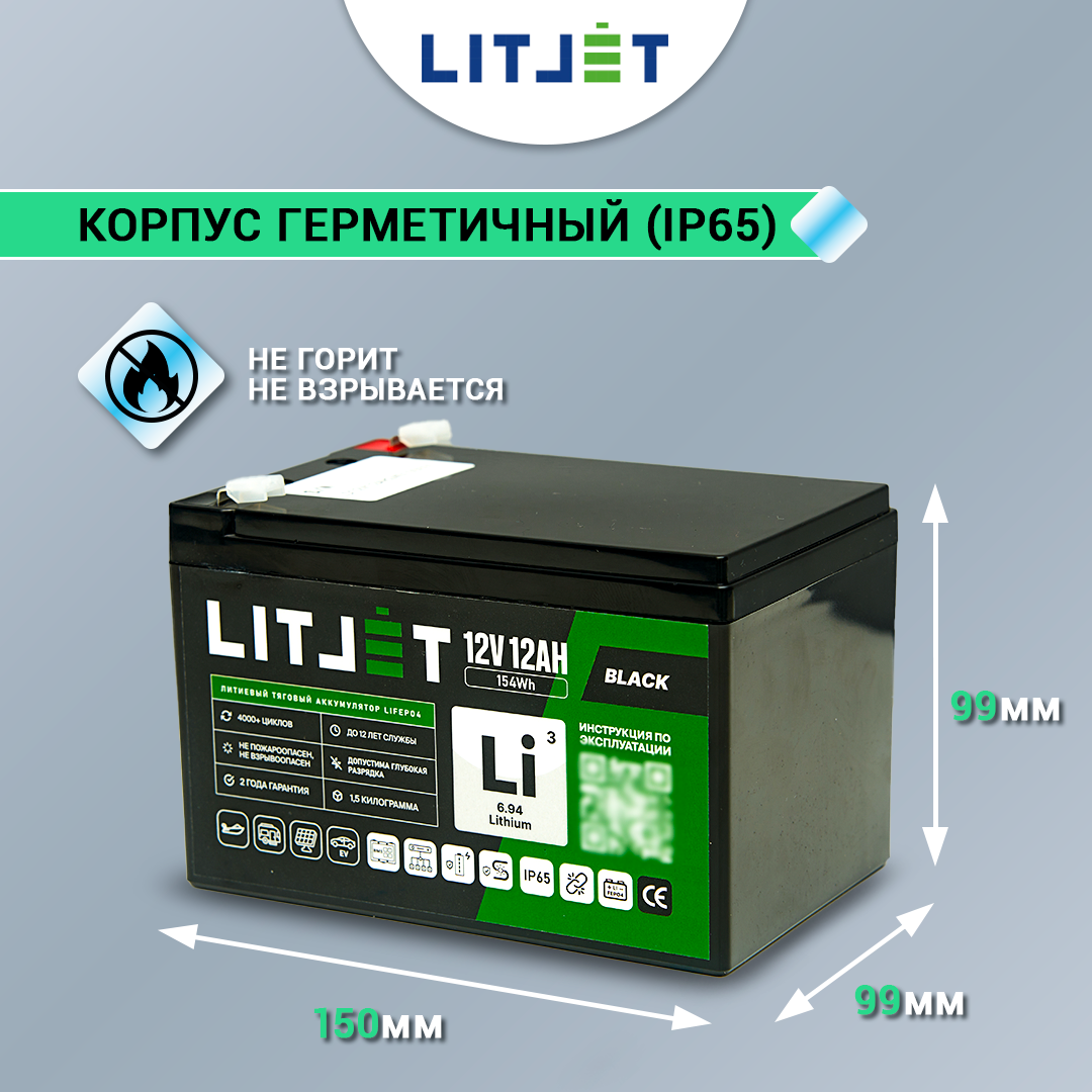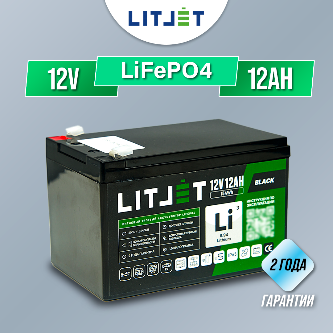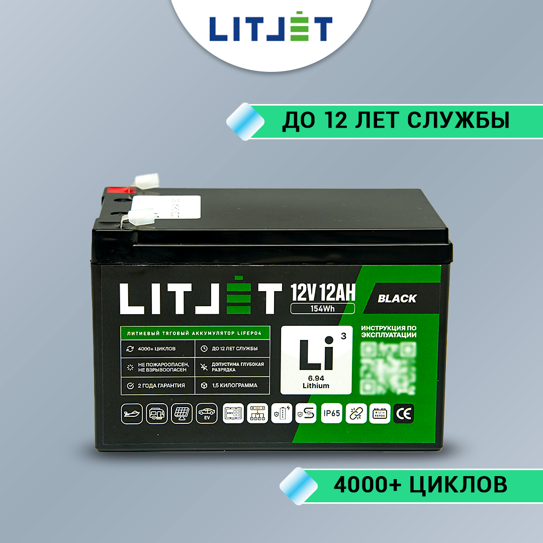 Тяговый аккумулятор LiFePO4 LITJET BLACK 12V 12Ah 154Wh для ИБП, эхолотов, детских электромобилей, охранных систем интересное: