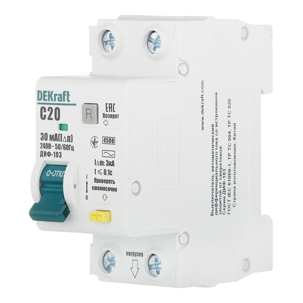 Дифференциальный автомат DEKraft ДИФ-103 1П 30 мА C 4.5 кА AC электромеханический 32 А