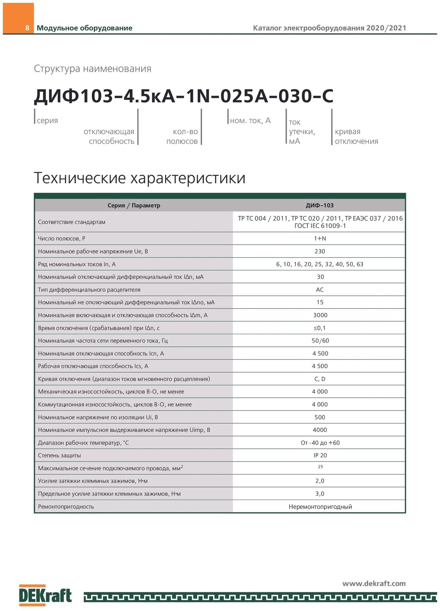 | Дополнительная информация | соответствие стандартам: ТР ТС 004 / 2011, ТР ТС 020 / 2011, ТР ЕАЭС 037 / 2016, ГОСТ IEC 61009-1; номинальный отключающий дифференциальный ток IΔn, мА 30; номинальный не отключающий дифференциальный ток IΔno, мА 15; номинальная включающая и отключающая способность IΔm, А 3000; номинальная частота сети переменного тока, Гц 50/60; номинальная отключающая способность Icn, А 4500; рабочая отключающая способность Ics, А 4500; кривая отключения (диапазон токов мгновенного расцепления) C, D; механическая износостойкость, циклов В-О, не менее 4000; коммутационная износостойкость, циклов В-О, не менее 4000; номинальное напряжение по изоляции Ui, В 500; номинальное импульсное выдерживаемое напряжение Uimp, B 4000; диапазон рабочих температур, °С -40..+60; максимальное сечение подключаемого провода, мм2 25; усилие затяжки клеммных зажимов, Н·м 2,0; неремонтопригодный |