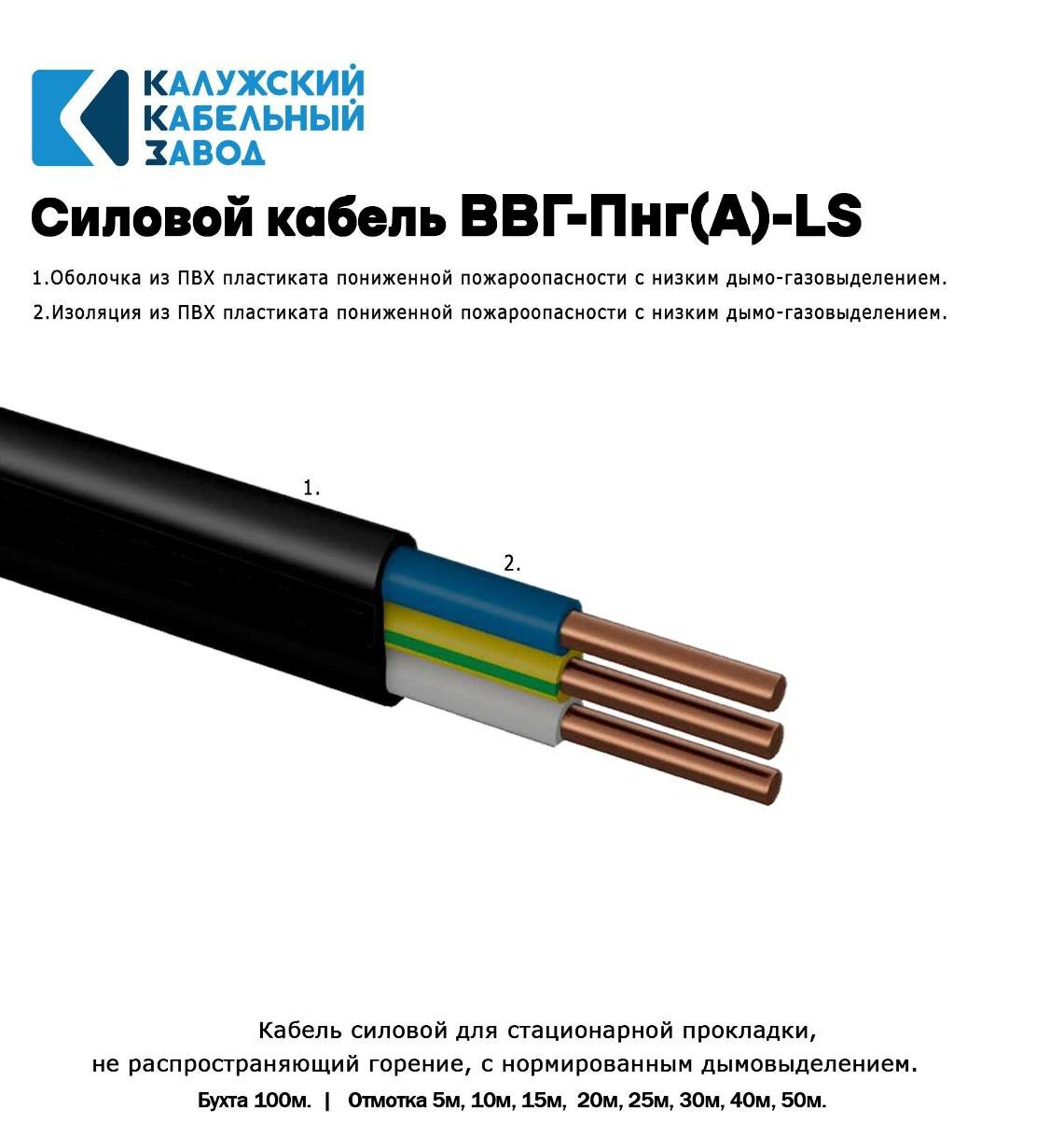Кабель силовой ВВГ-Пнг(А)-LS 3х10 ГОСТ. 5 метров. Кaлyжcкий кабельный зaвoд