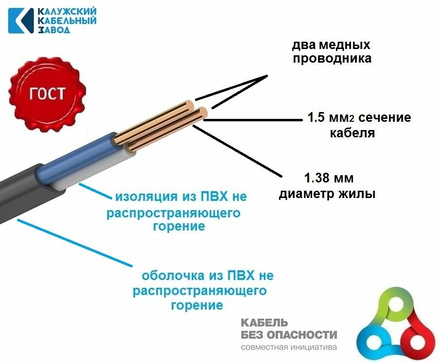 Кабель ВВГ-Пнг(А)-LS 2х1,5 ГОСТ Калужский кабельный завод, 15 метров