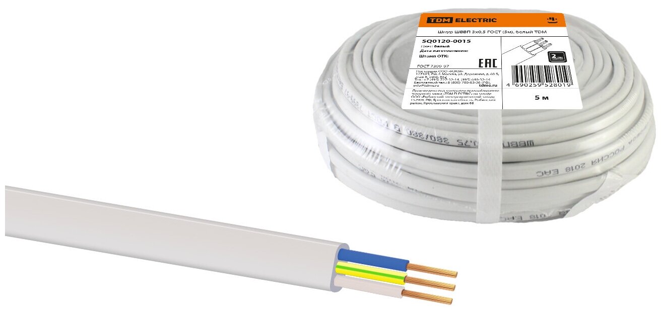 Шнур ШВВП 3х0,5 ГОСТ (5м), белый, TDM SQ0120-0015 (5 м.) интересное:
