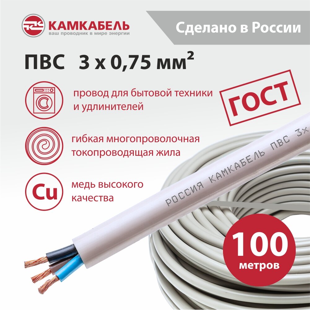 Электрический провод Камкабель ПВС 3 х 0,75 кв. мм, 100 м