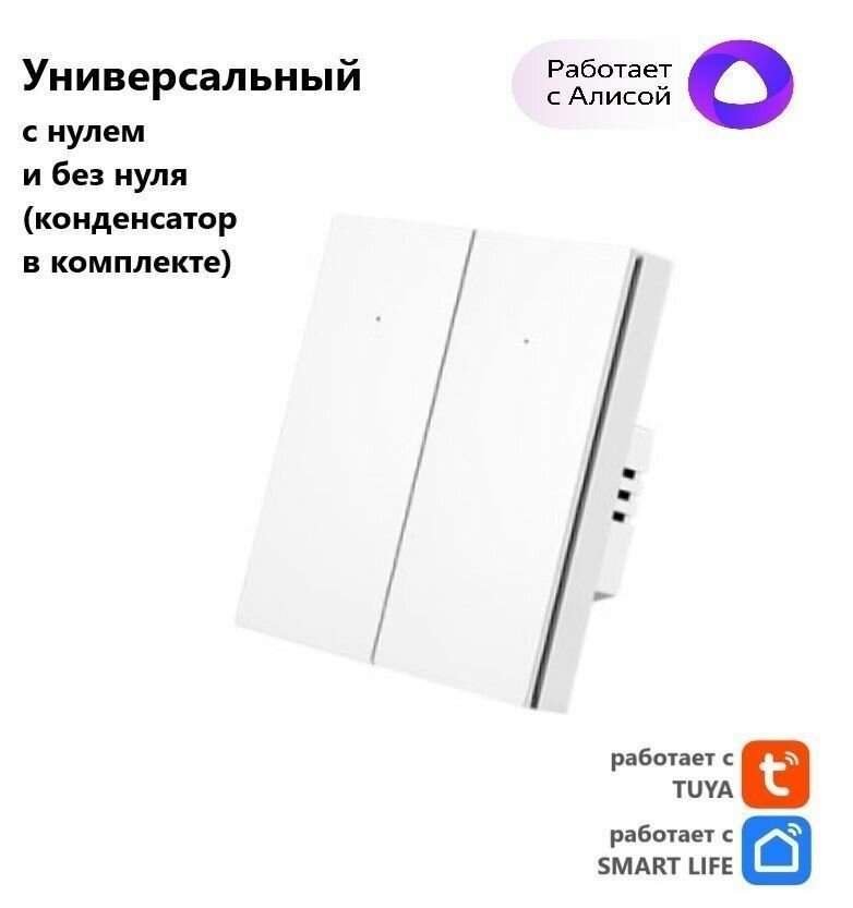 Умный выключатель двухклавишный белый Wi-Fi + Bluetooth, универсальный (конденсатор в комплекте)