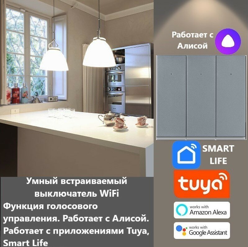 Умный выключатель Tuya с Алисой WI FI, Bluetooth с тремя клавишами светло-серый матовый универсальный с конденсатором в комплекте
