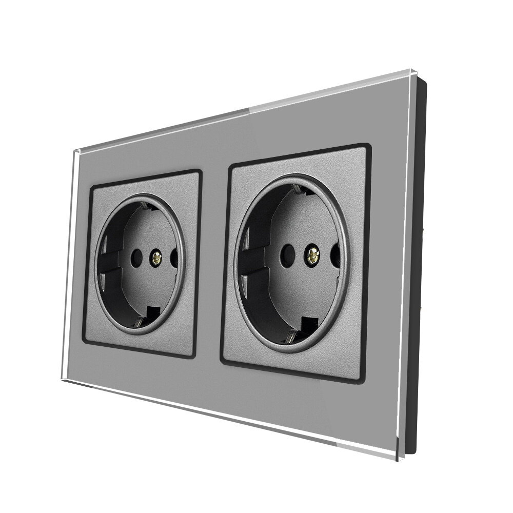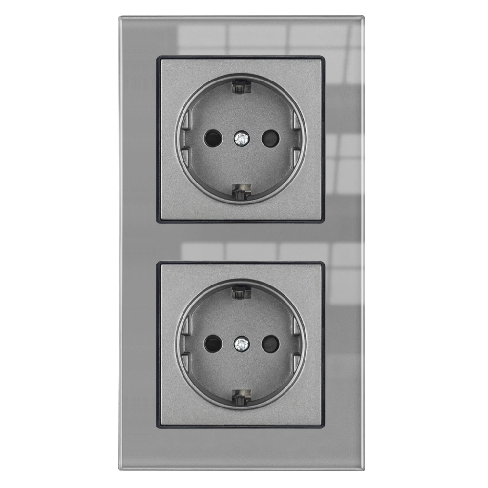 Купить Розетка двойная 2 поста 16А 250В, со шторками, рамка закаленное стекло, Серый