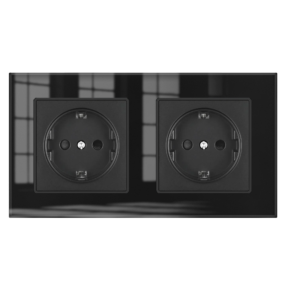 Купить Розетка двойная 2 поста 16А 250В, со шторками, рамка закаленное стекло, чёрный