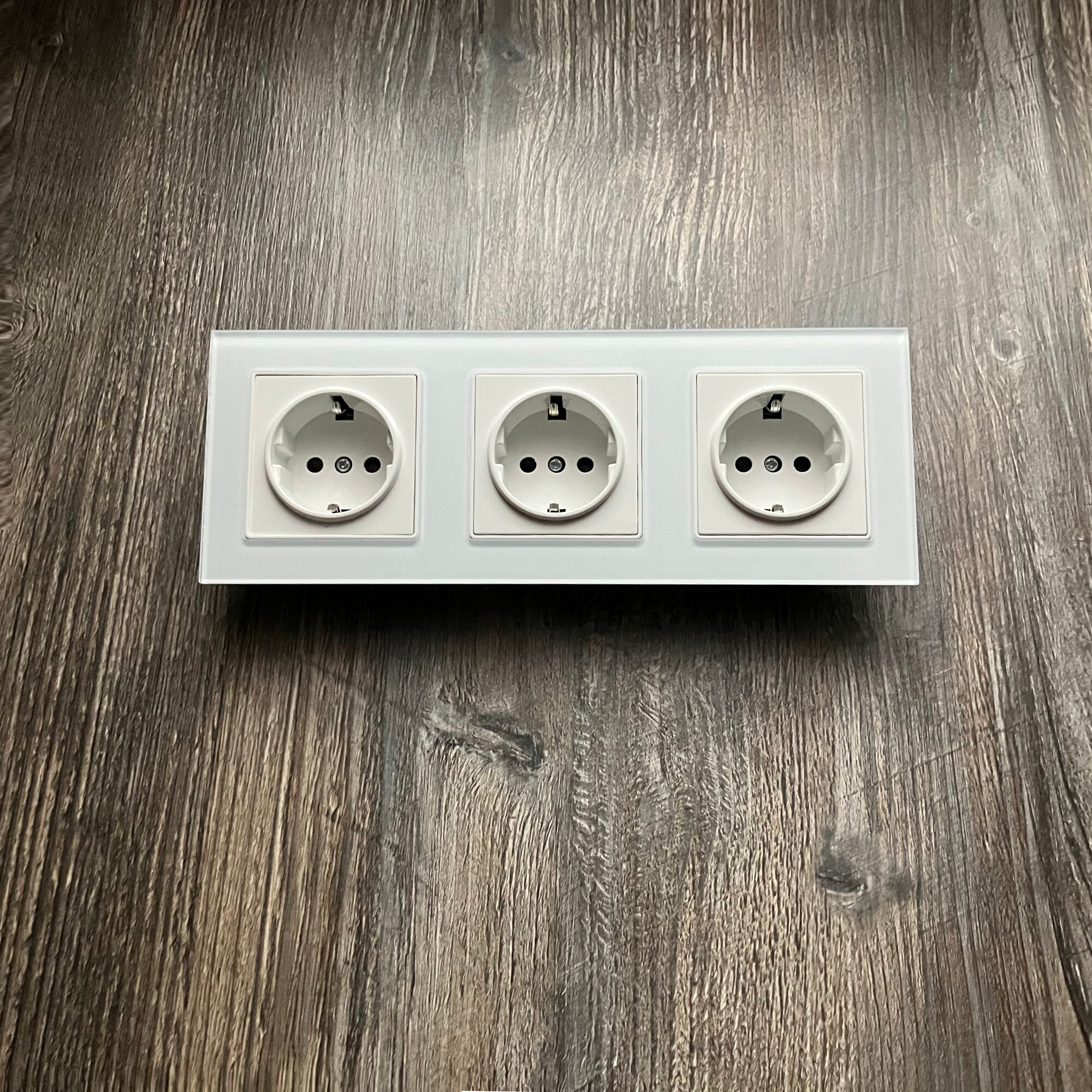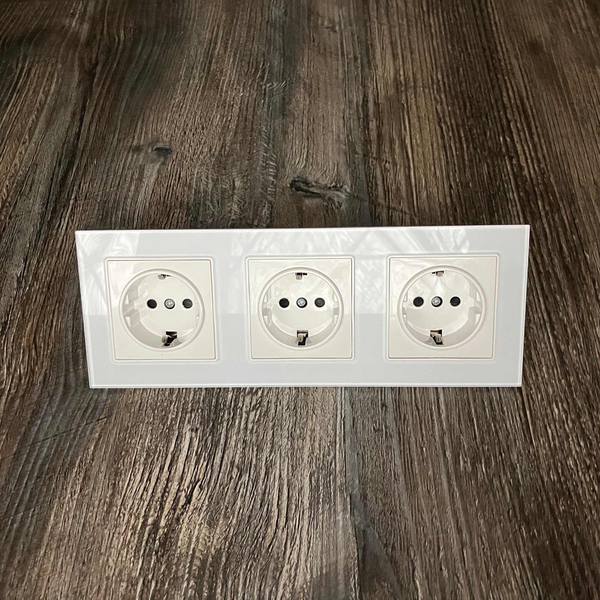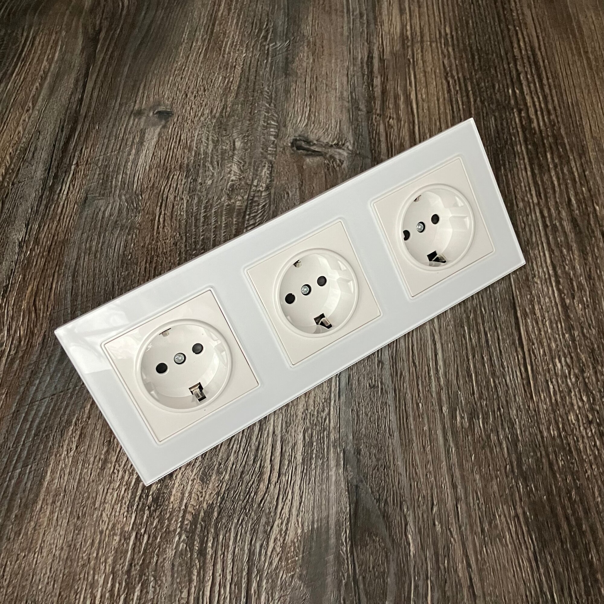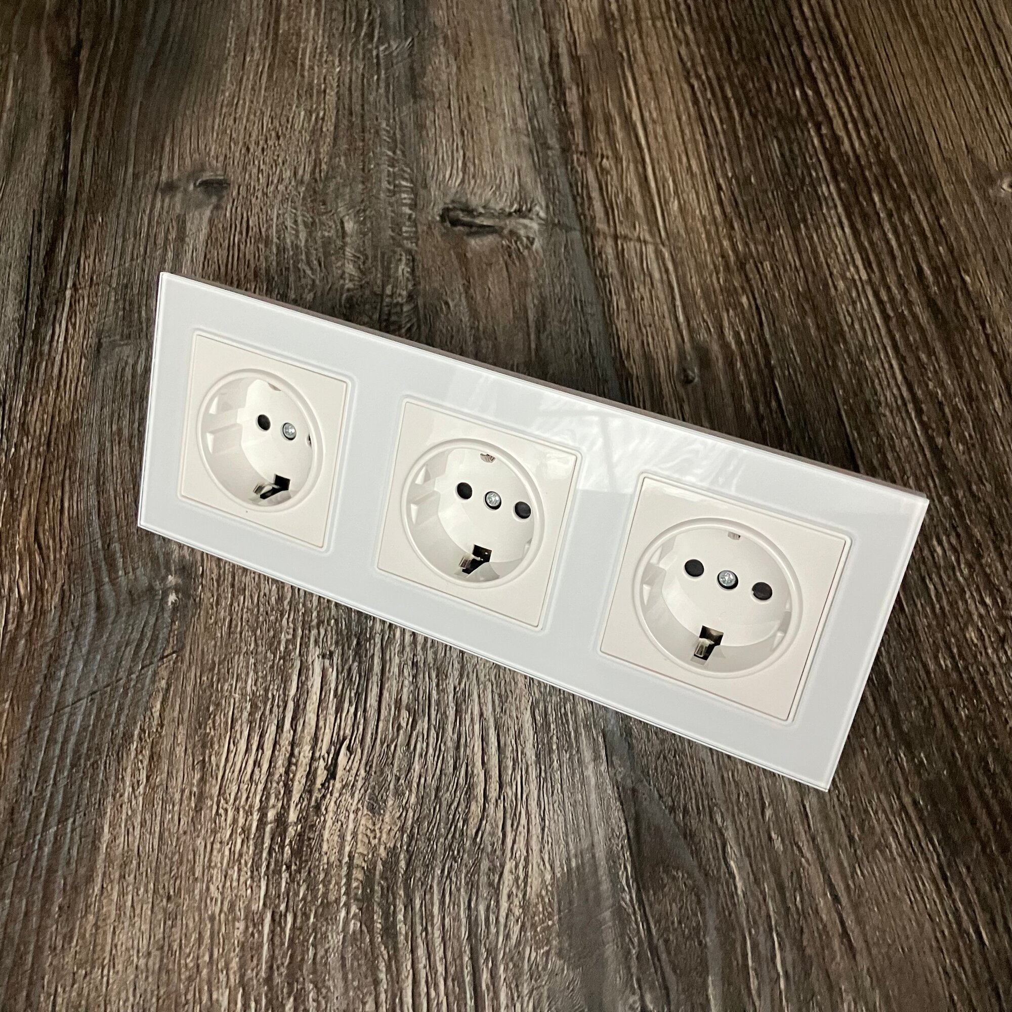 Купить Розетка тройная 16А 250В, со шторками, рамка закаленное стекло, Белый