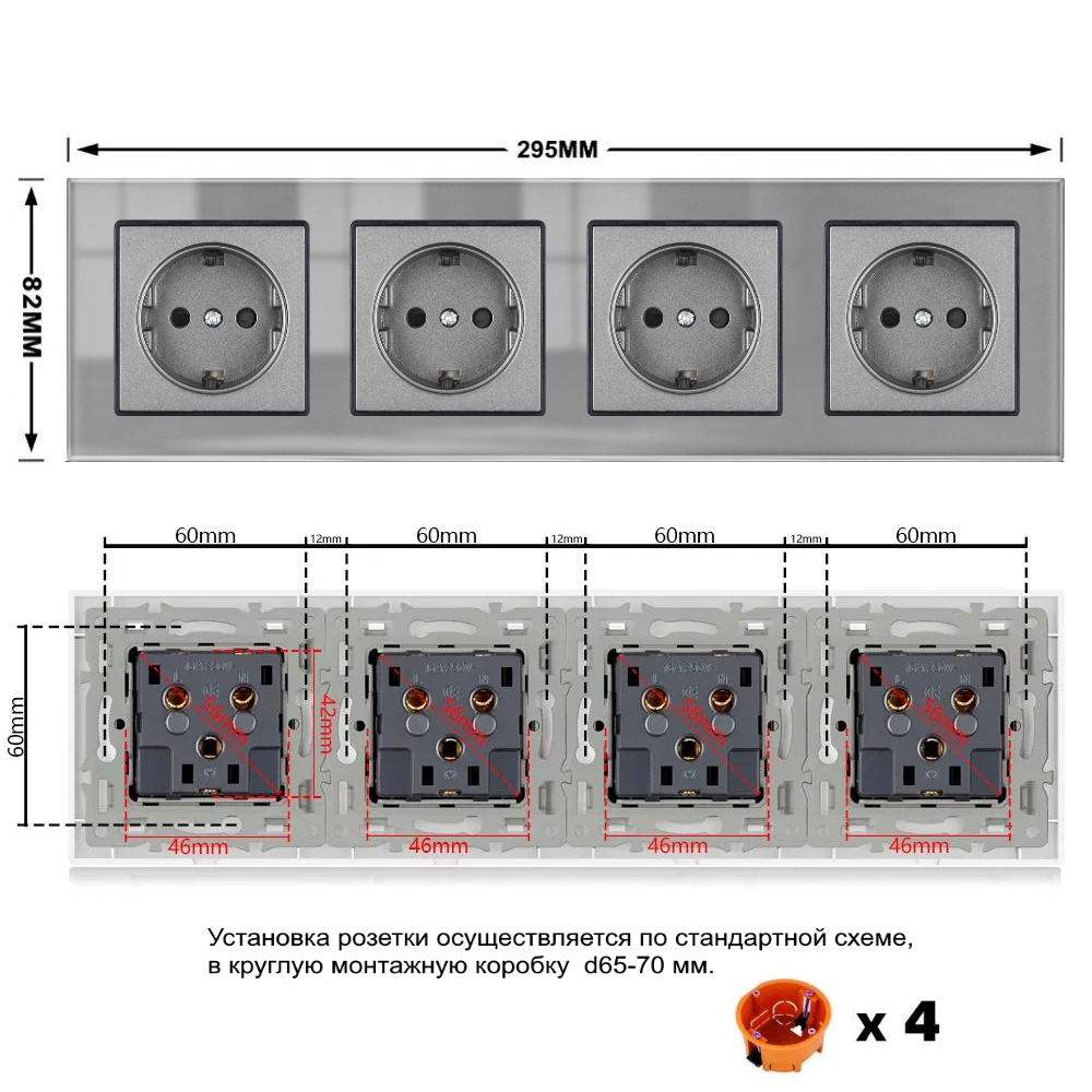 СохранитьРозетка четверная 4 поста 16А 250В, со шторками, рамка закаленное стекло, Серый интересное: