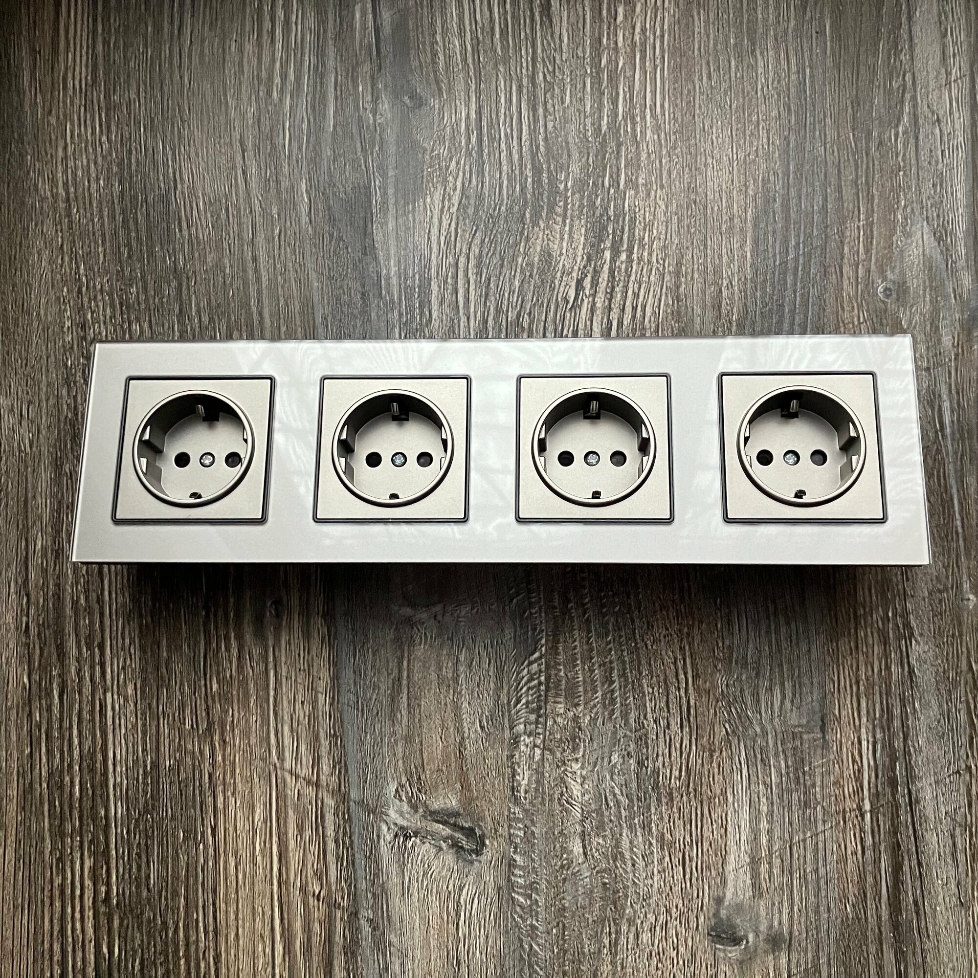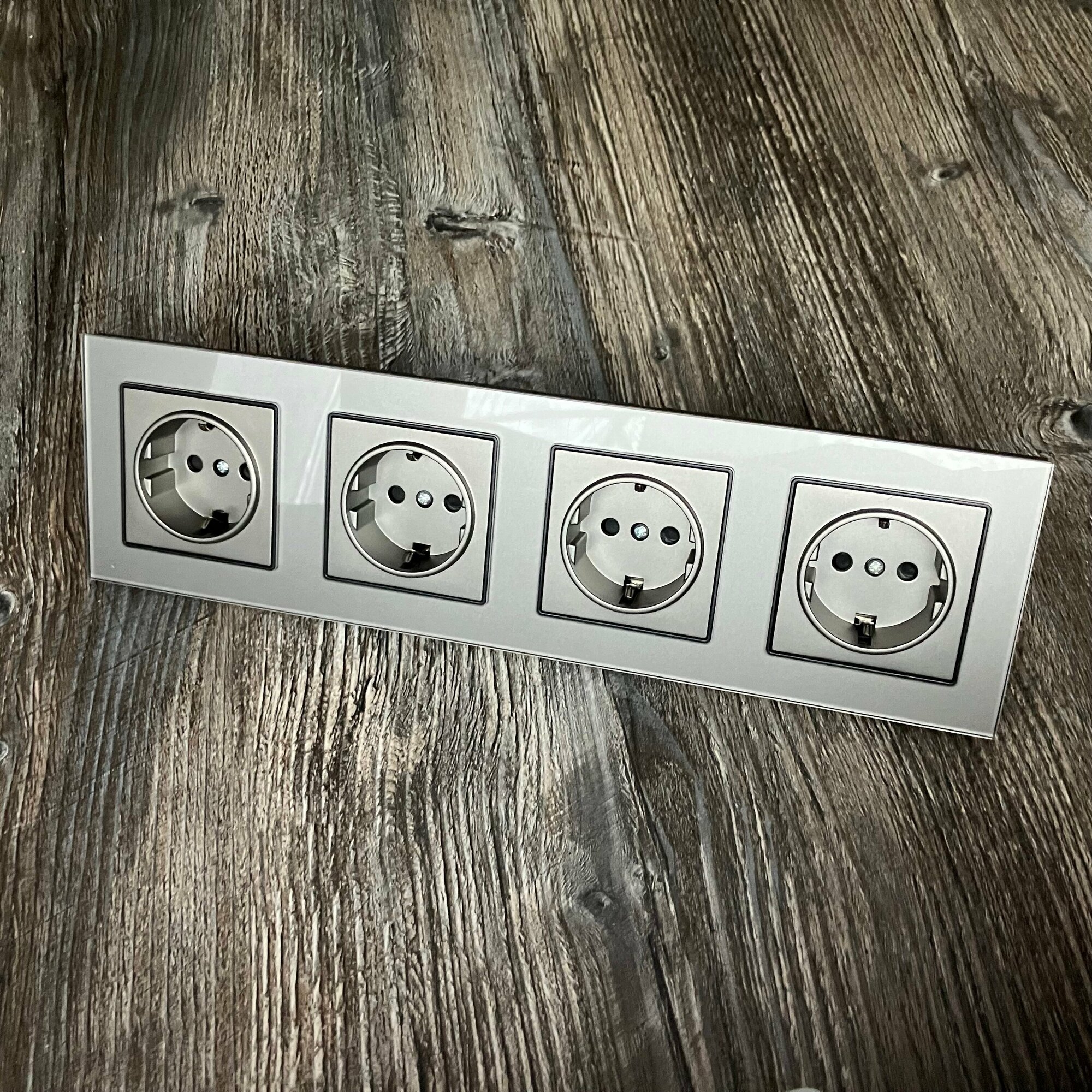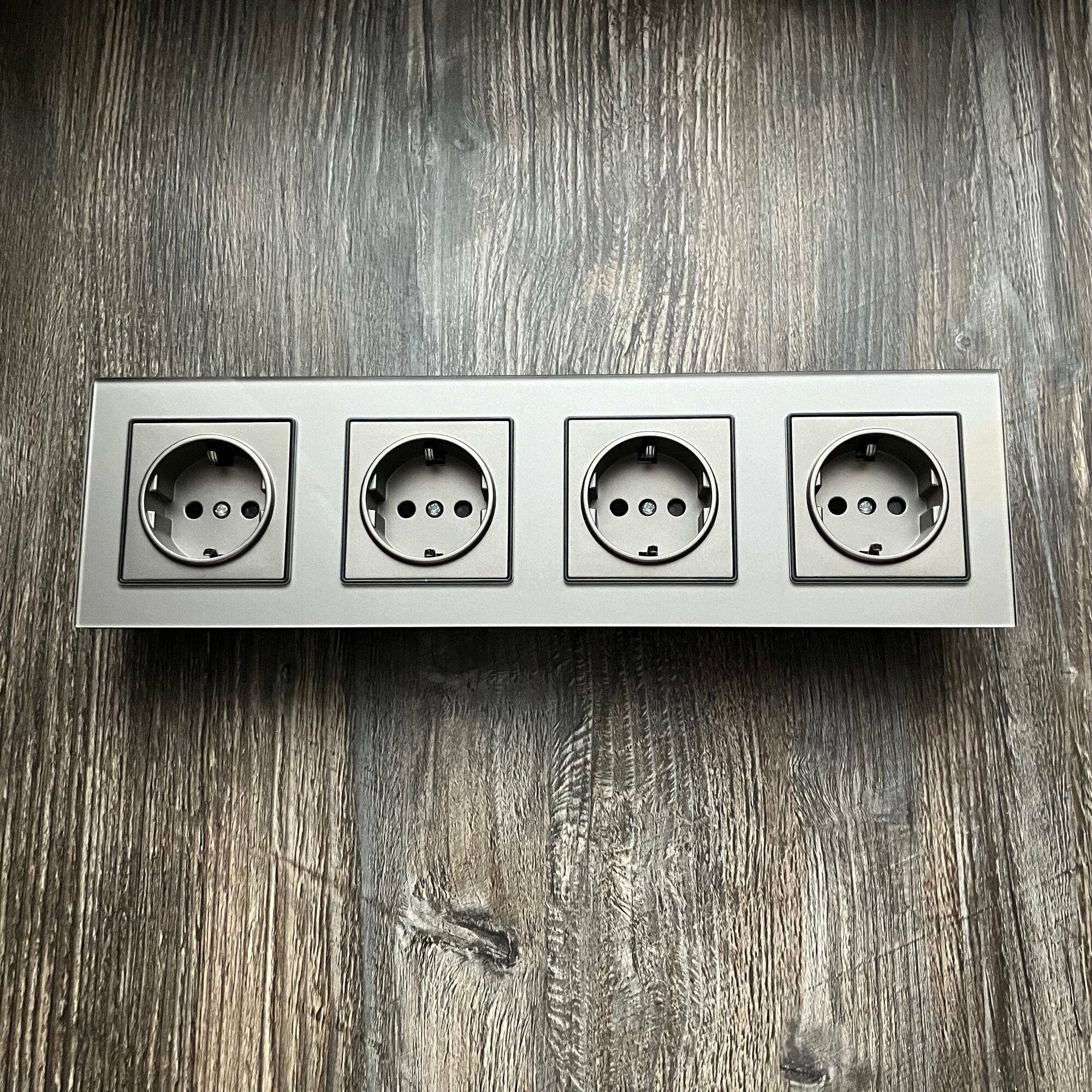 Купить Розетка четверная 4 поста 16А 250В, со шторками, рамка закаленное стекло, Серый
