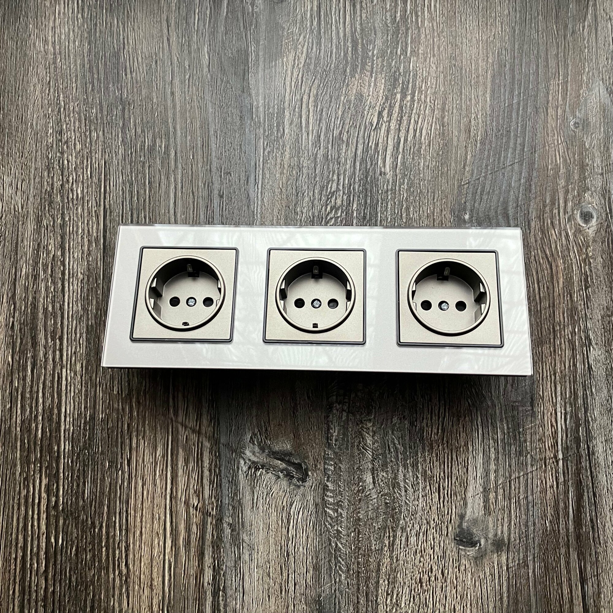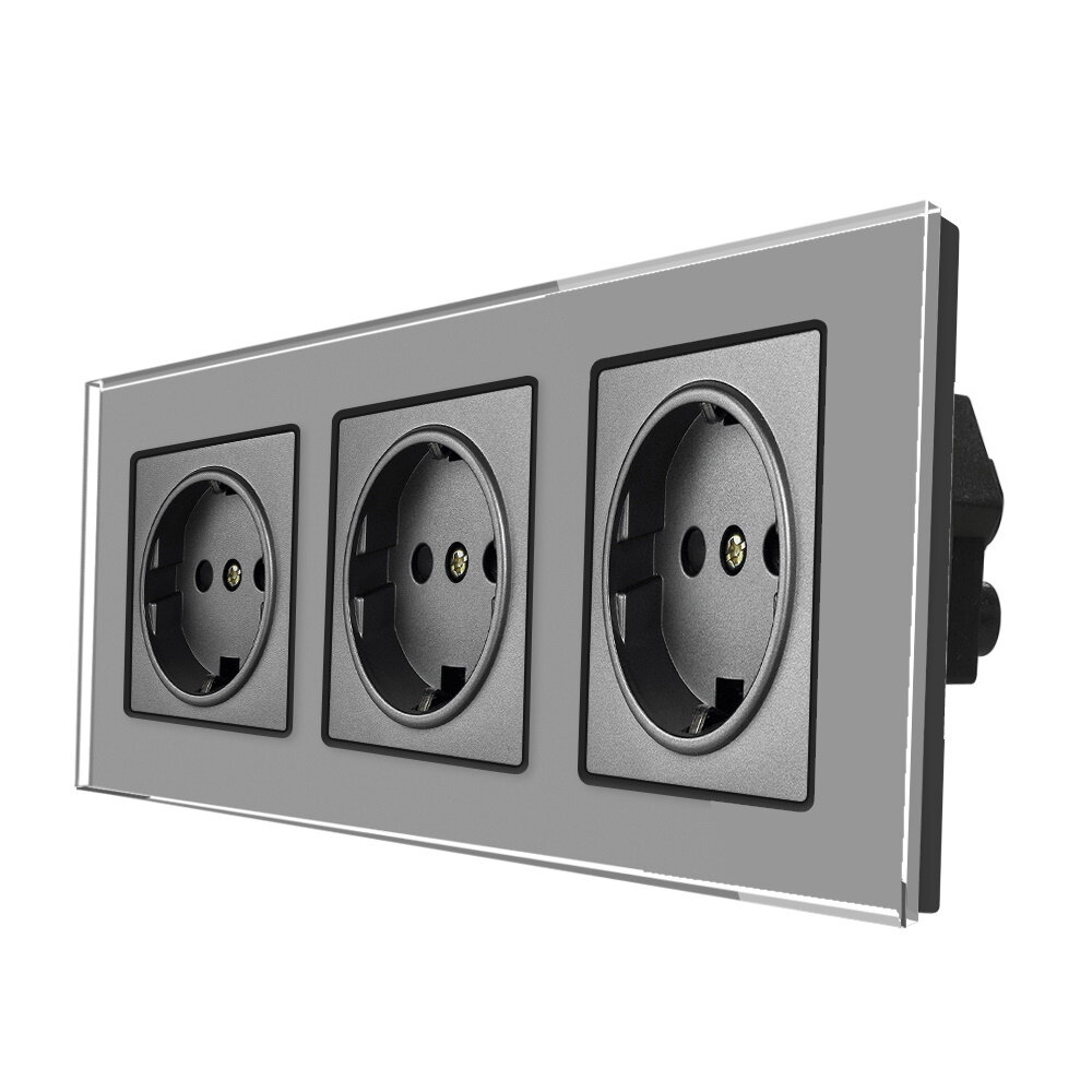 Купить Розетка тройная 16А 250В, со шторками, рамка закаленное стекло, Серый