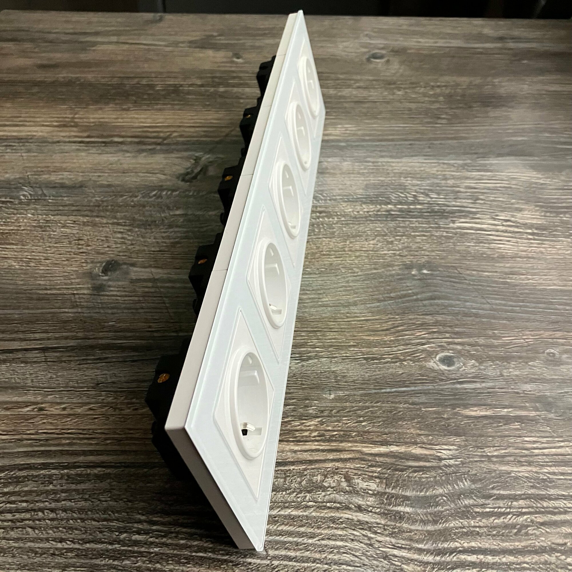 Розетка четверная 4 поста 16А 250В, со шторками, рамка закаленное стекло, Белый