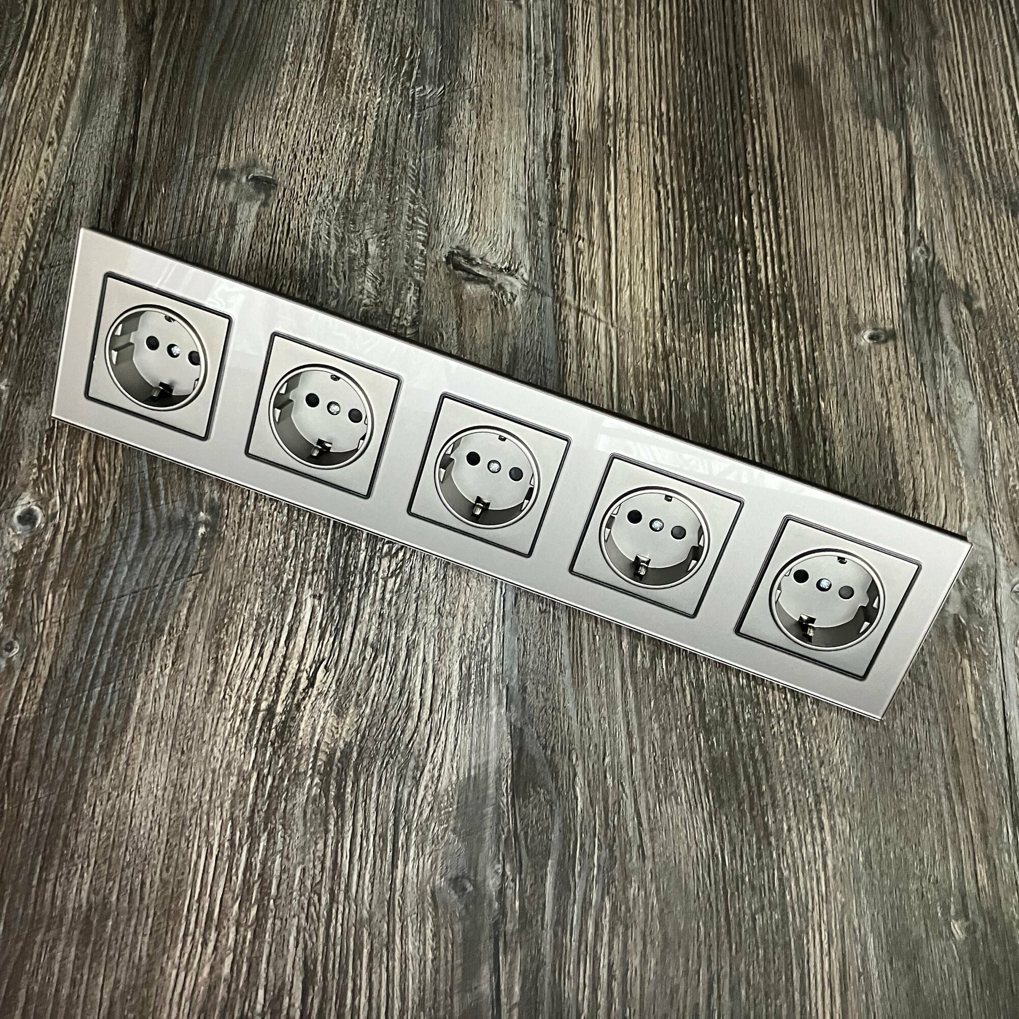 Купить Розетка пятипостовая 5 постов 16А 250В, со шторками, рамка закаленное стекло, Серый