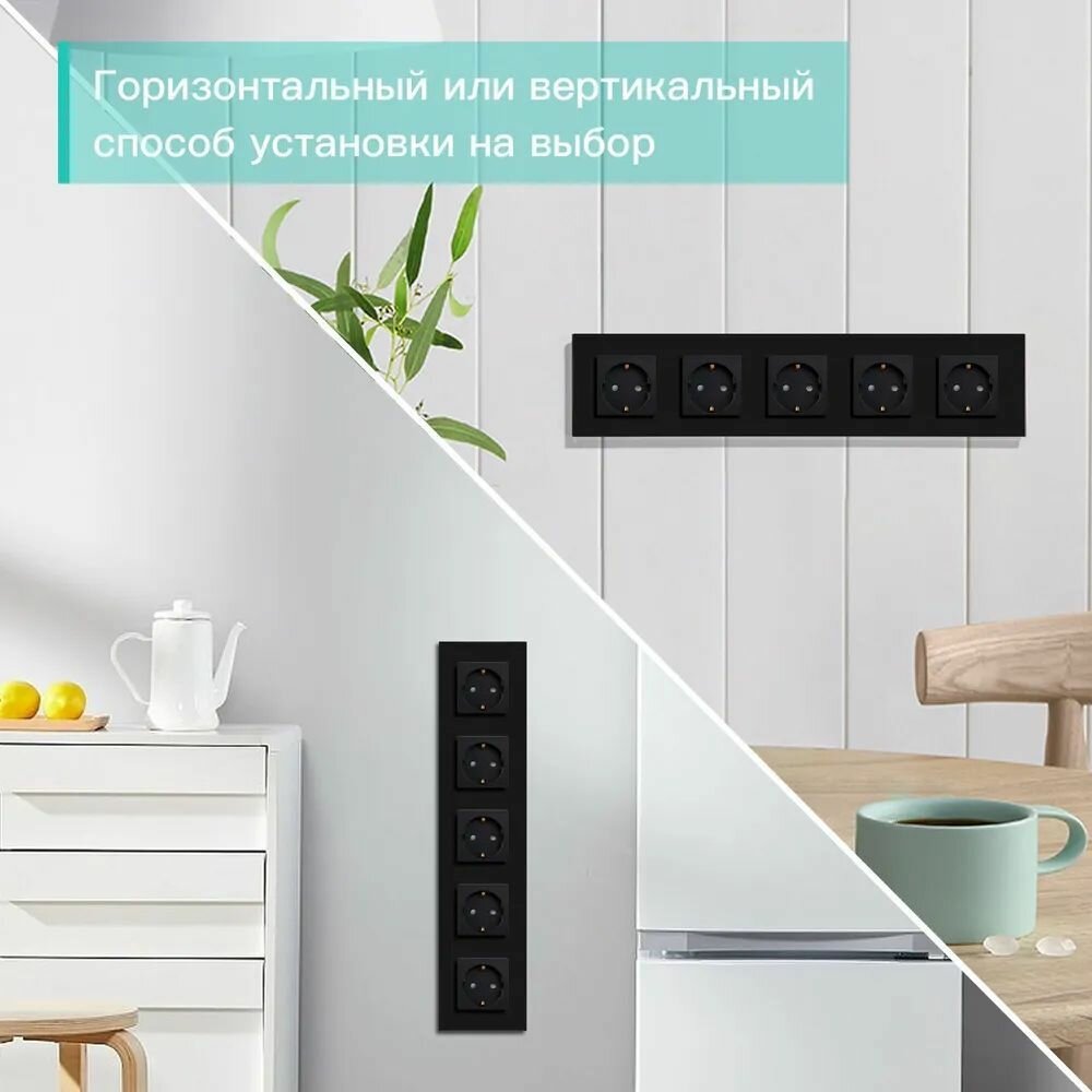 Купить Розетка электрическая 5 постов 16А, рамка 370х86мм стекло, цвет черный