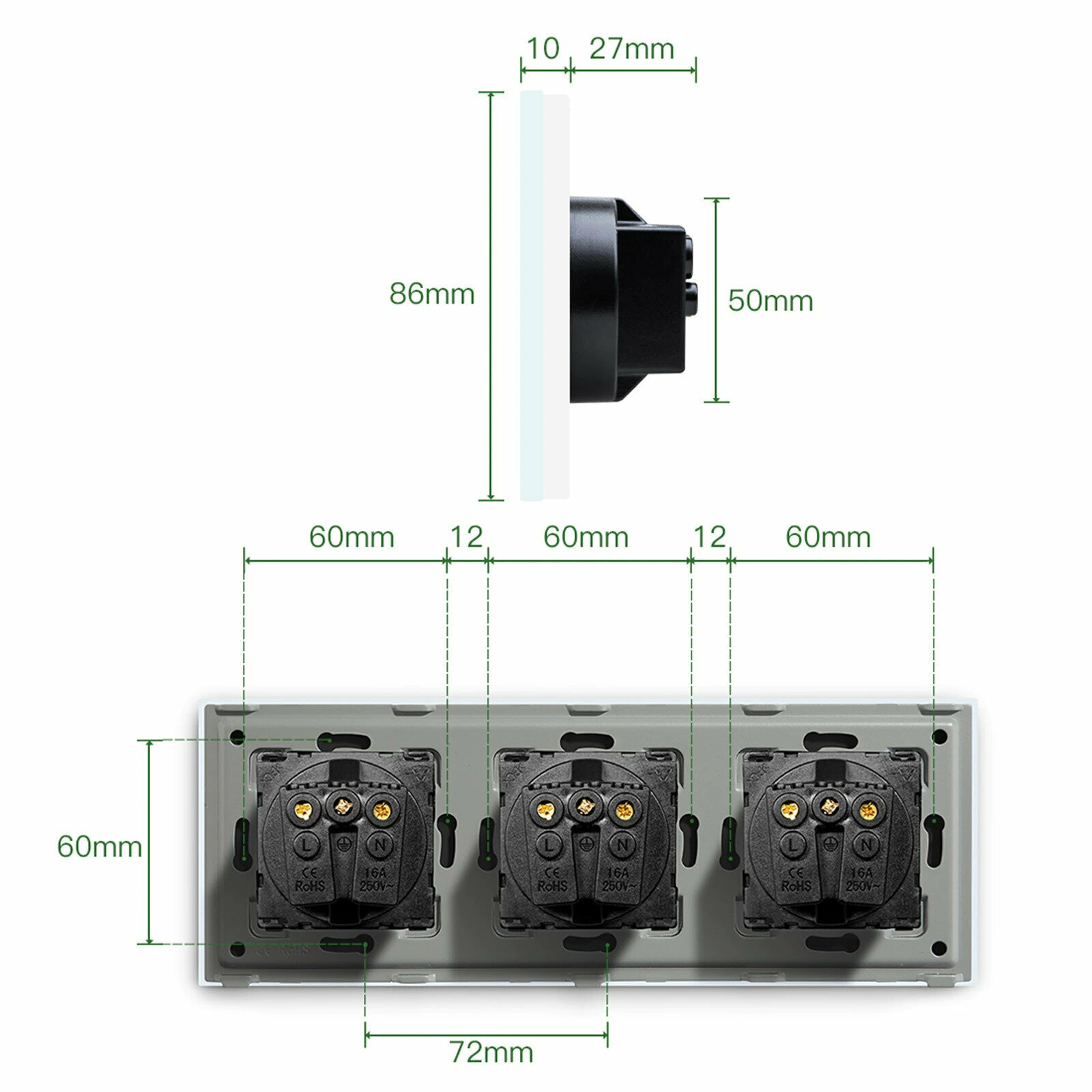 Розетка электрическая 3 поста 16А, рамка 228х86мм стекло, цвет черный