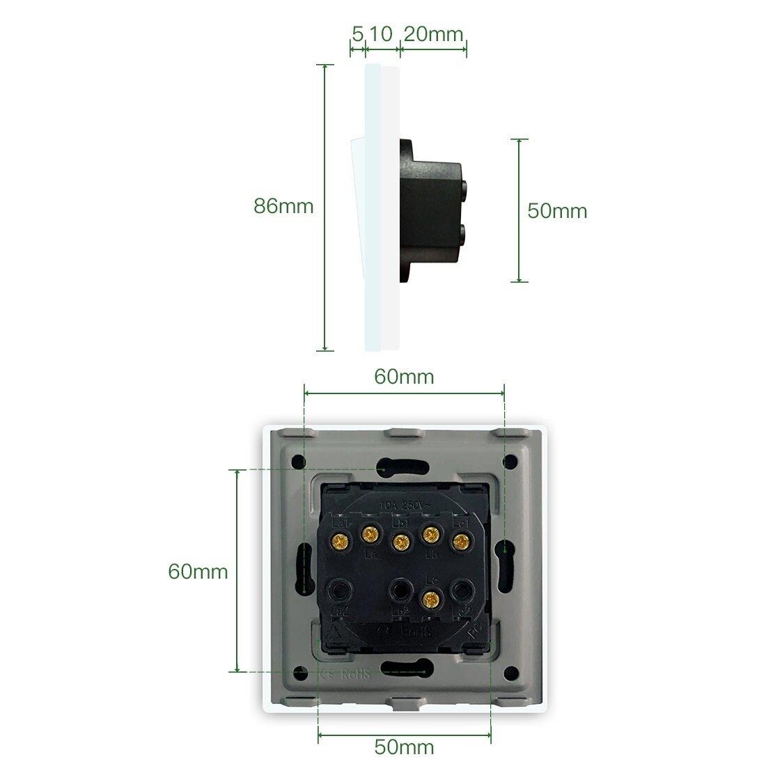 Выключатель механический, 2 клавиши, 1 пост, рамка стекло 86х86мм , цвет белый
