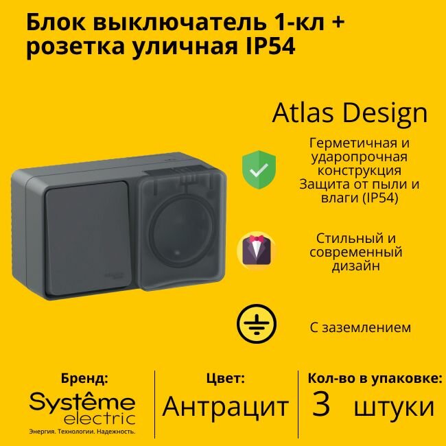СохранитьБлок выключатель + розетка уличная IP54, пылевлагозащищенная электрическая 1-клавишная Schneider Electric (Systeme Electric) Atlas Design с заземлением, с защитными шторкми, 16А, Антрацит - 3 шт. интересное: