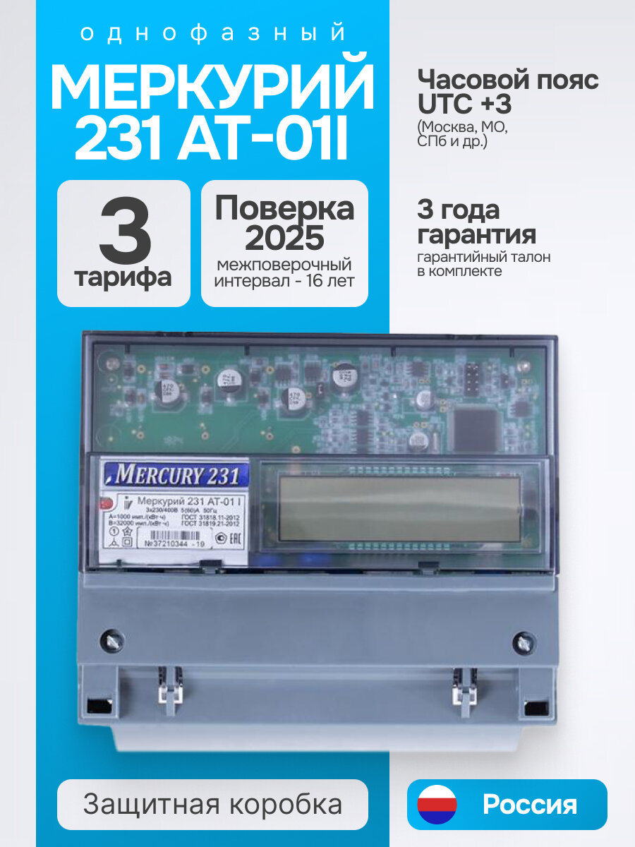 Счетчик электроэнергии меркурий 231 АТ-01i 3*230/400В, 5(60)А, трехфазный, ЖКИ, запрограммирован (трехтарифный, часовой пояс: GMT+3 (Москва) интересное: