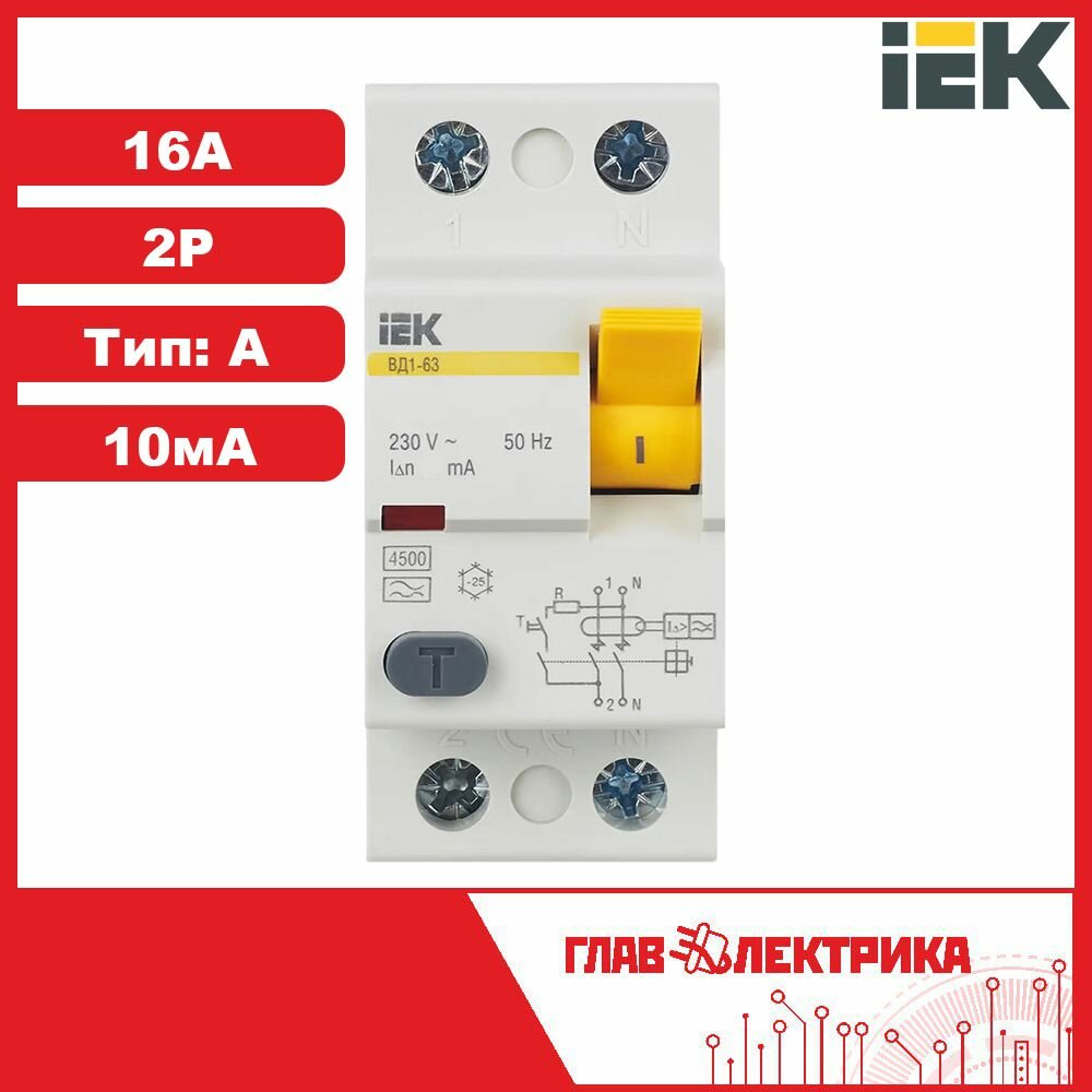 Выключатель дифференциального тока (УЗО) 2п 16А 10мА тип A ВД1-63, IEK MDV11-2-016-010 (1 шт.)