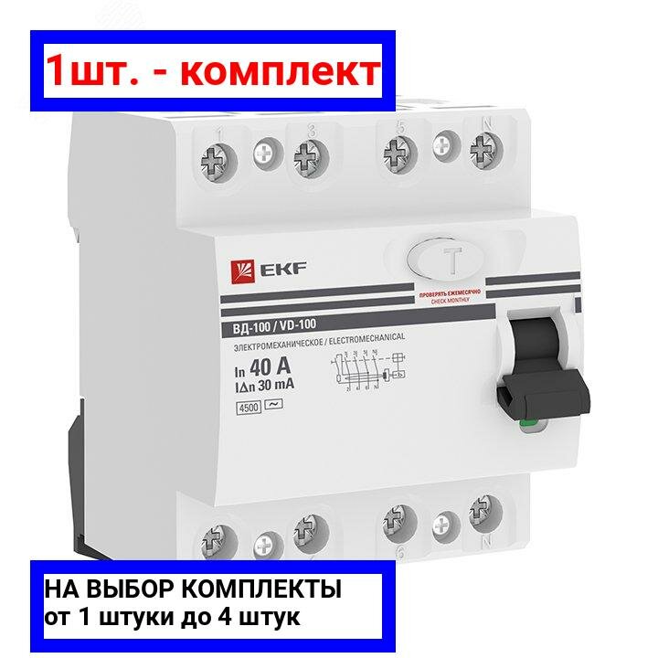 Купить Устройство защитного отключения УЗО ВД-100 4 полюса, 40А, Тип AC, 30мА | код. elcb-4-40-30-em-pro | EKF (3шт.в упак.)