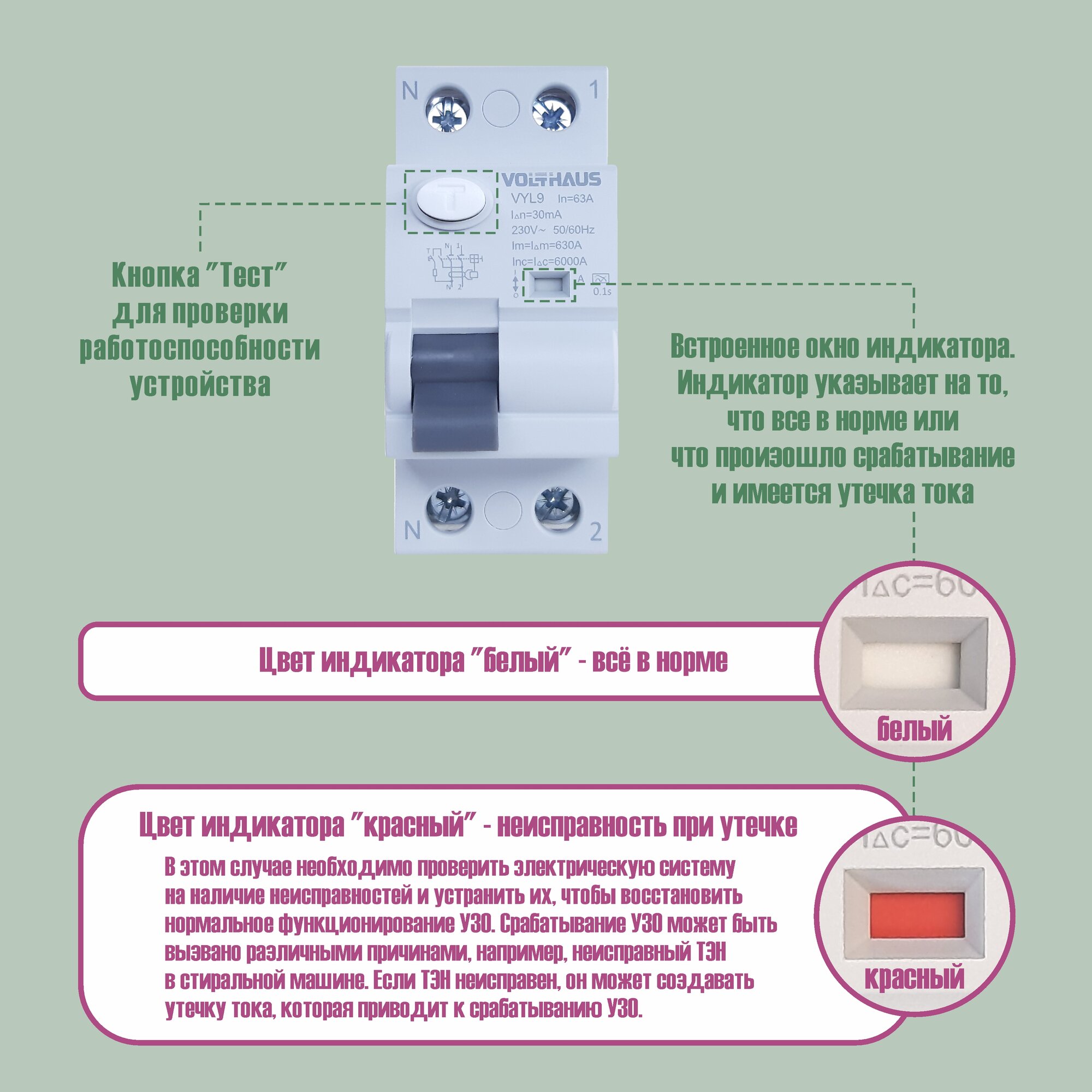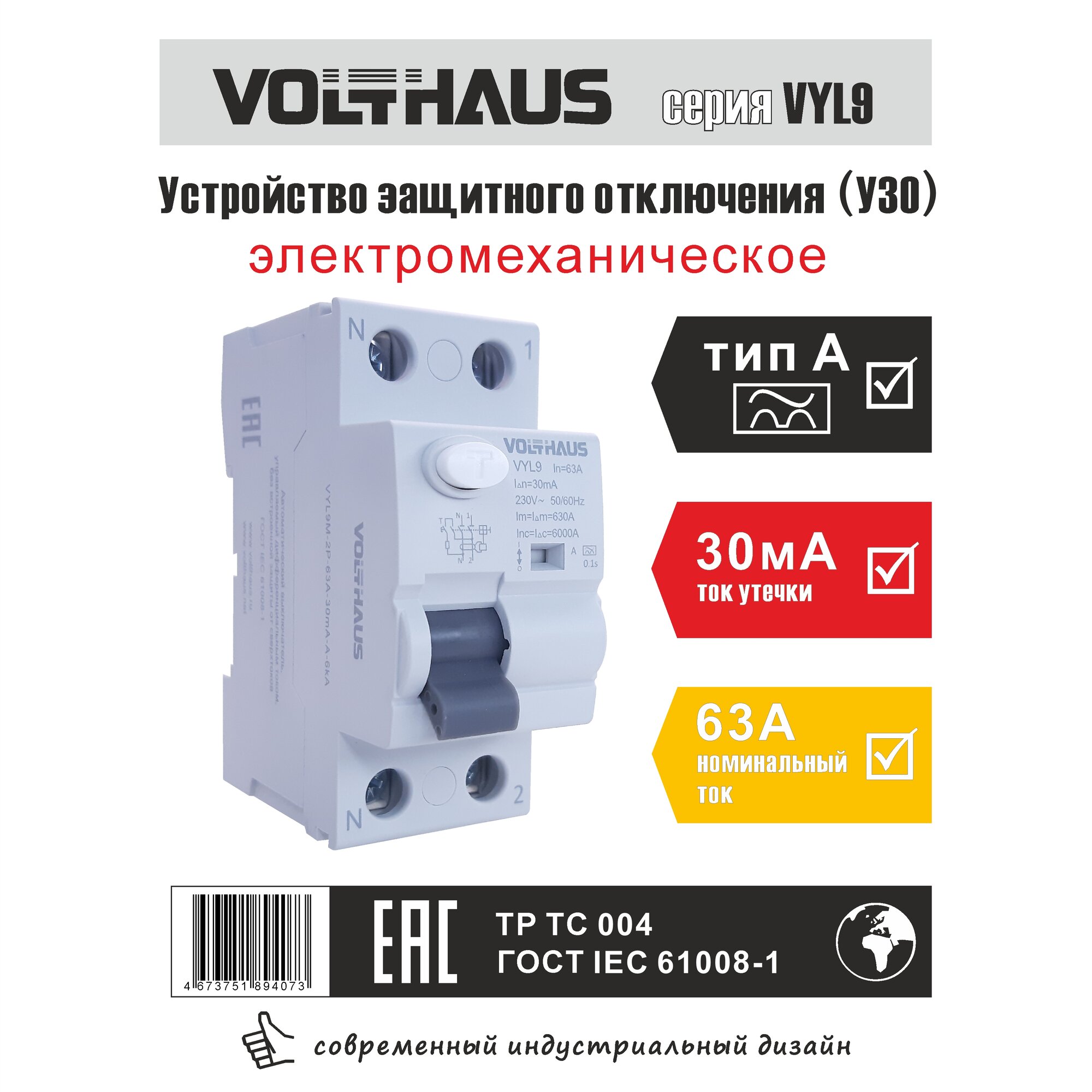 Устройство защитного отключения (УЗО) VOLTHAUS VYL9 электромеханического типа (M) 1P+N 63A 30mA тип А 6кА интересное: