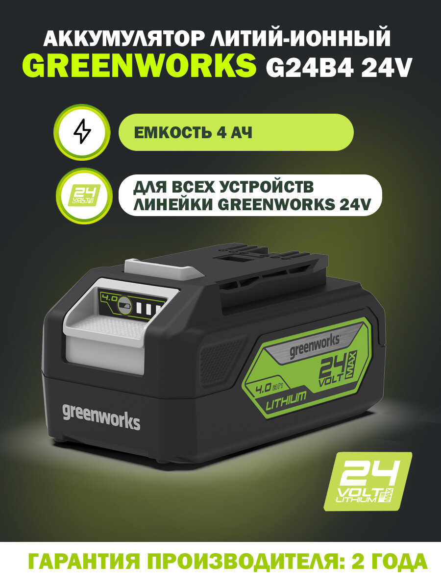 Аккумуляторная батарея GREENWORKS 24 V, 4,0 A*h 2926807 интересное:
