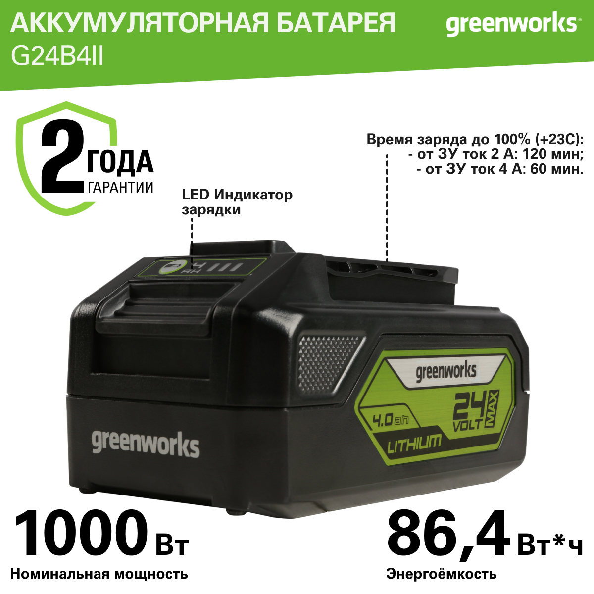 | Совместимость | все устройства линейки greenworks 24V |