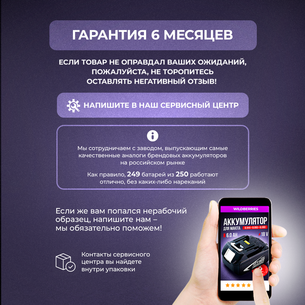 | Совместимость | Мakita BL1820; BL1825; BL1830; BL1830B; BL1835; BL1840; BL1840B; BL1850; BL1850B; BL1860; BL1860B; BDF451, BDF451Z, BDF452RFE, BDA350, BDF452SHE, BDF454RFE, BDF452Z, BDF451RFE, BDF452, BDA350Z; BTD140, BTD141, BTDW251Z, BTD140SFE, BTD140Z, BTD141Z, BTD144Z, BTD144, BTW251, BTW450, BTW450Z, 194204-5, 194205-3, 194309-1, 197265-4, 197280-8, 197422-4, 197423-2, 197599-5, 198311-60. |