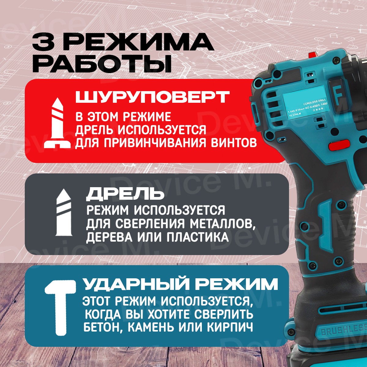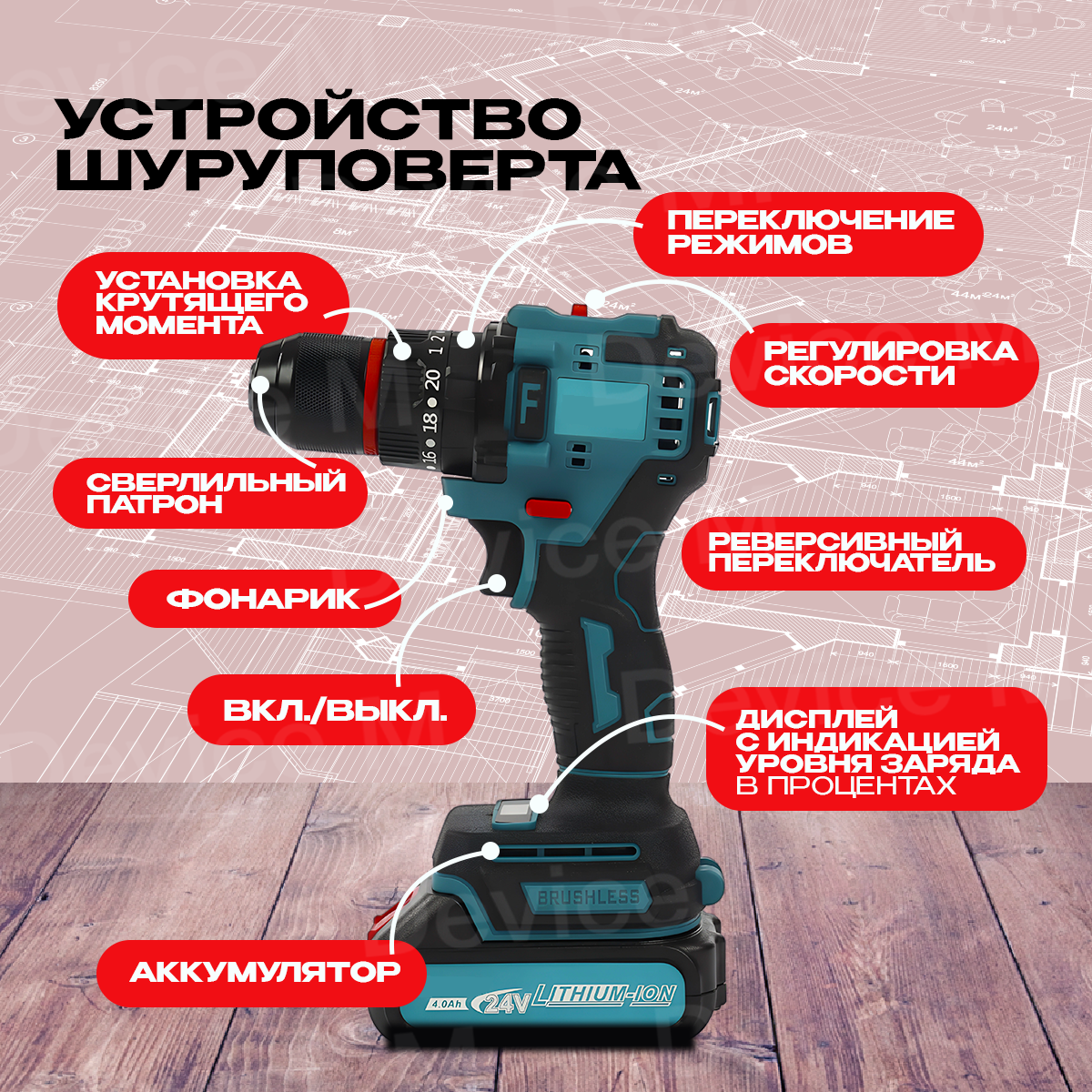 Дрель - шуруповерт ударный аккумуляторный бесщеточный, 24В, 2 АКБ интересное: