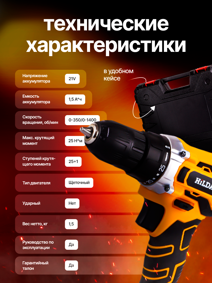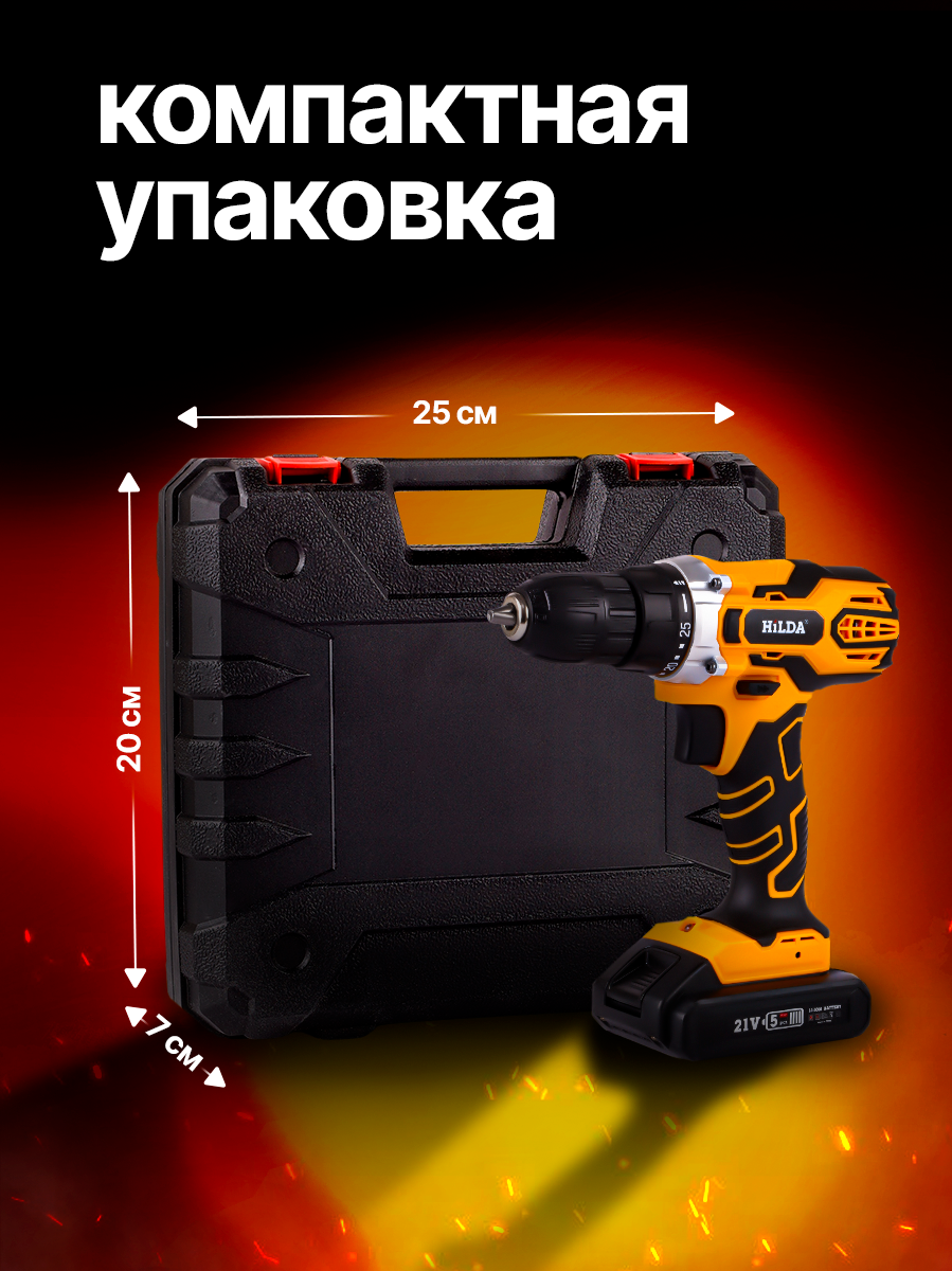 Дрель-шуруповерт с двумя литиевыми батареями, 2 скорости, Hilda 21v в кейсе с инструментами интересное: