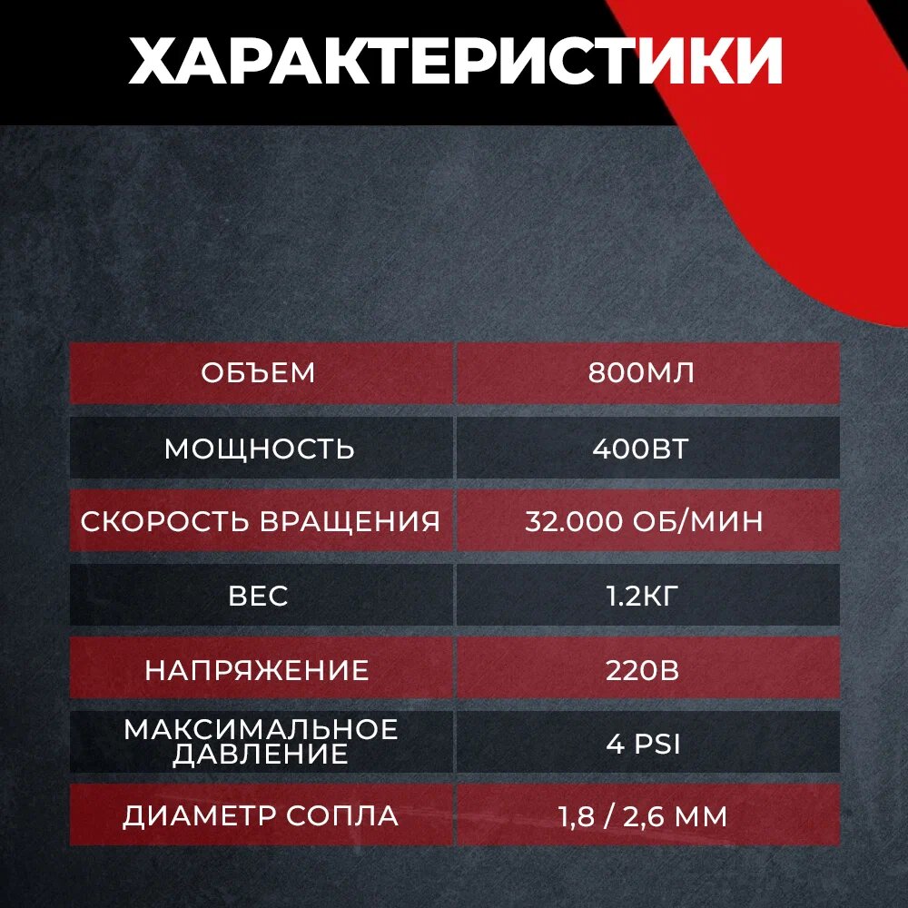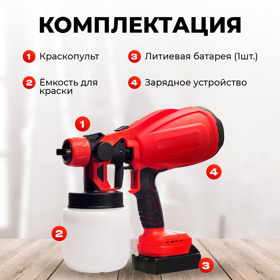 | Комплектация | краскопульт: 1 шт. ёмкость для краски: 1 шт. зарядное устройство: 1 шт. литионный аккумулятор: 1 шт. |
