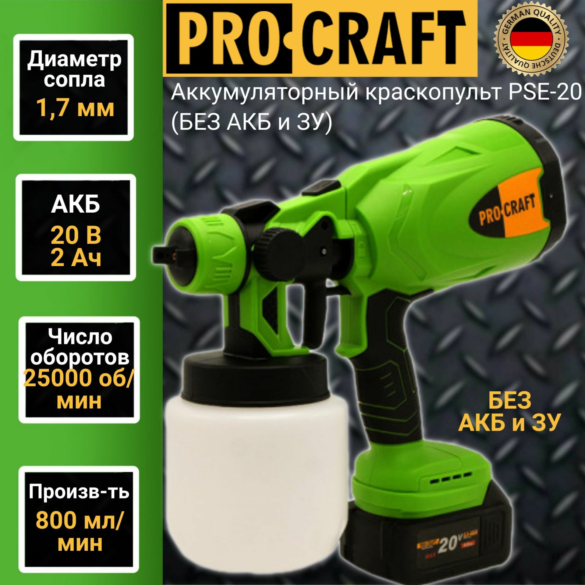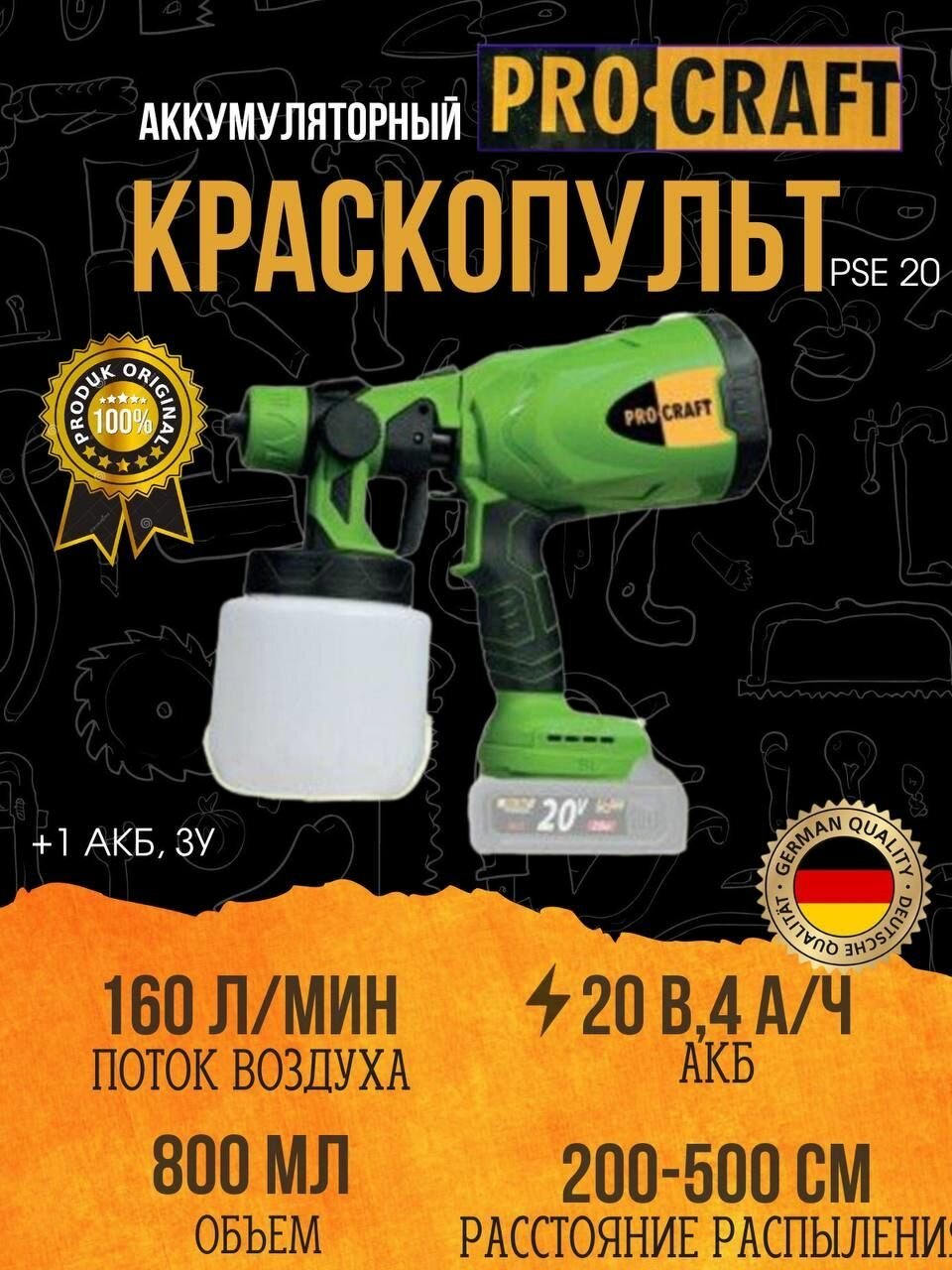 Краскопульт аккумуляторный PROCRAFT PSE20 (1АКБ+ЗУ) , 20 В 2 А/ч , 160 Л/мин, 800мл интересное: