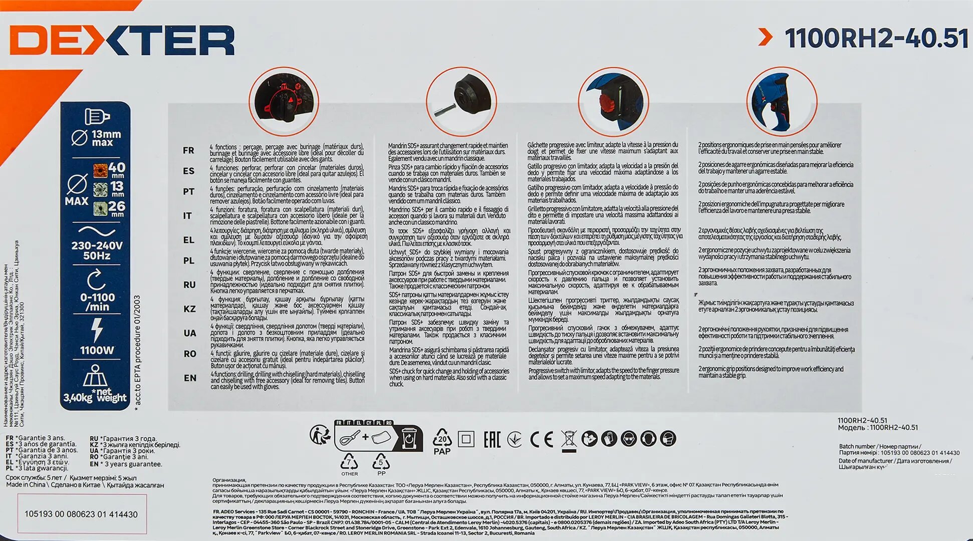 Перфоратор сетевой SDS-plus Dexter 5 1100RH2-40.51, 1100 Вт, 3.5 Дж интересное: