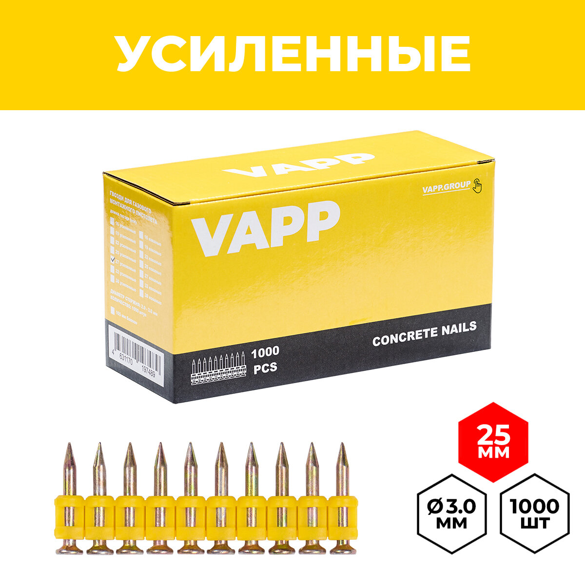 Гвозди усиленные VAPP 3*25 мм для газового монтажного пистолета, 1000 шт.