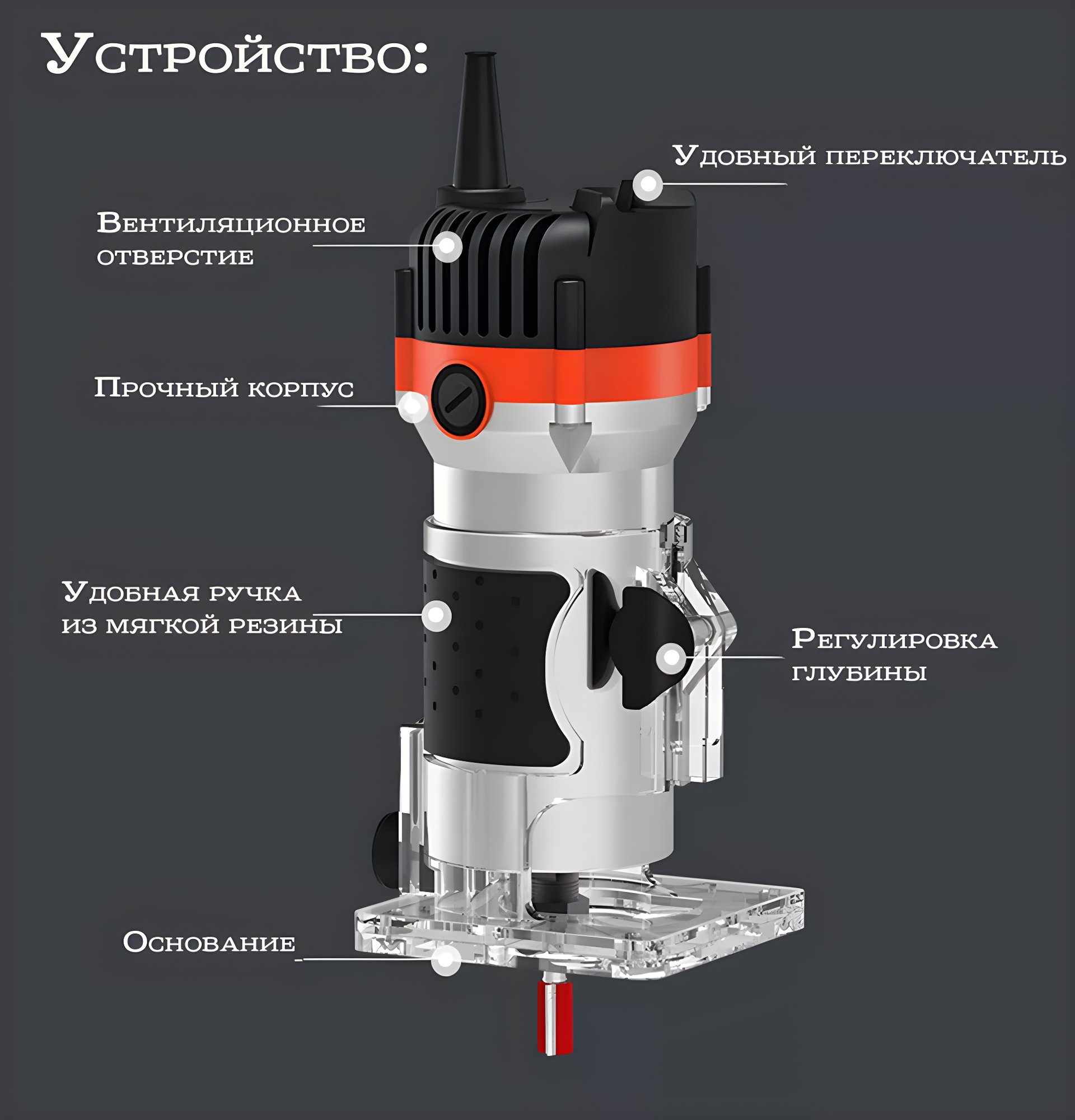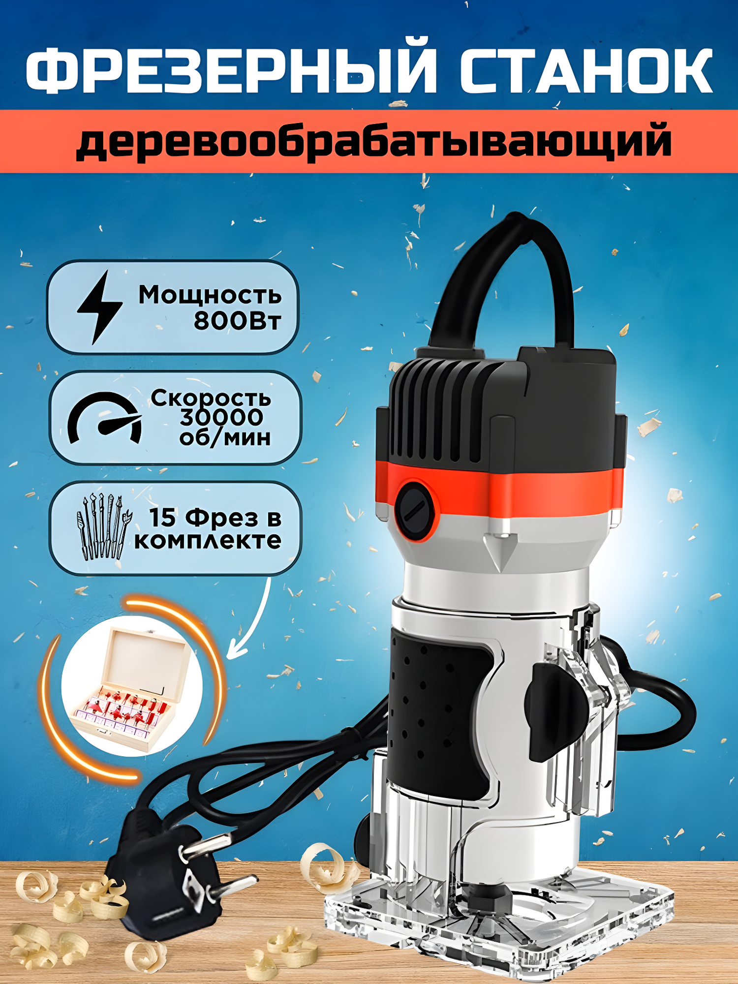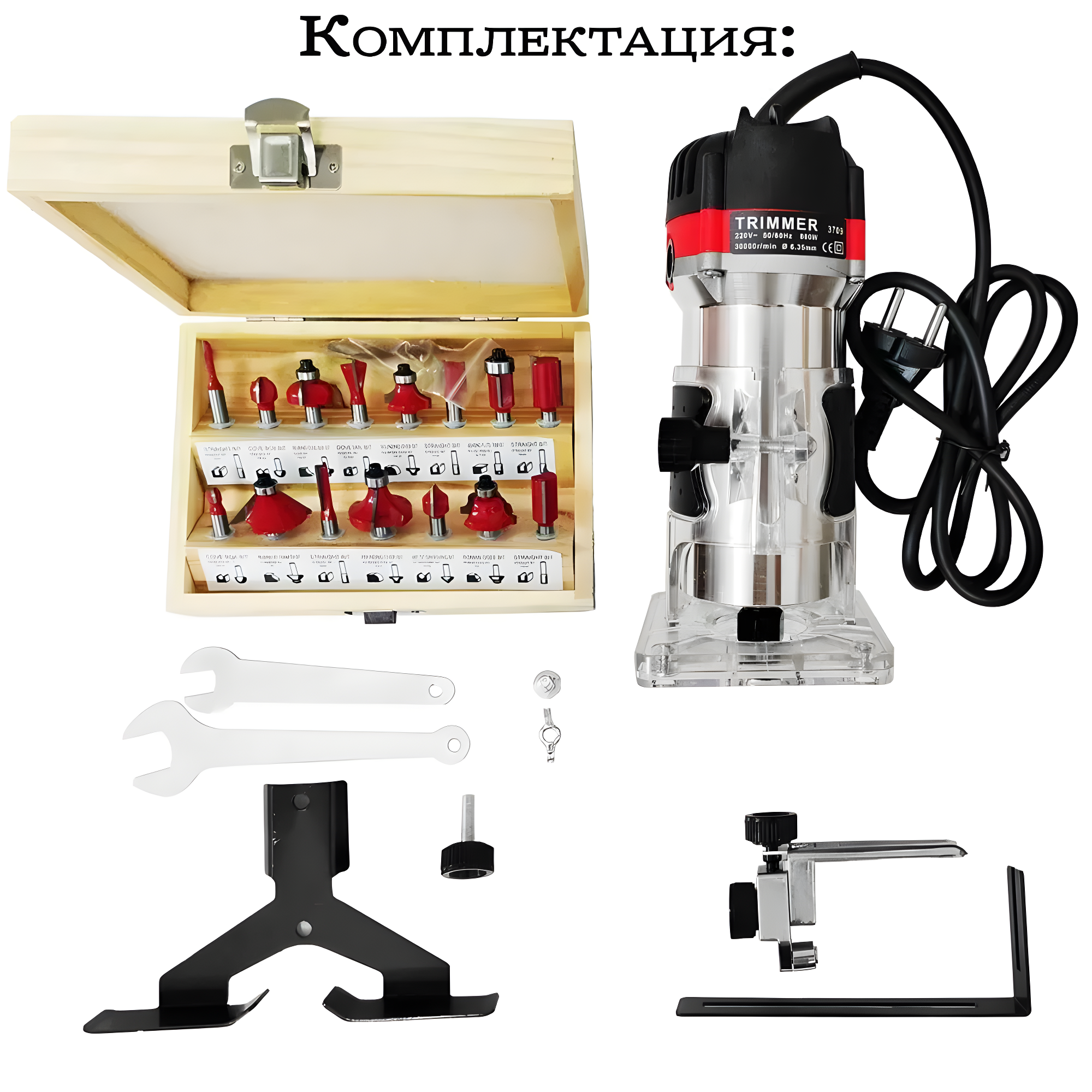| Подробная комплектация | Фрезер, 15 фрез, монтажная ручка, винт, направляющая |