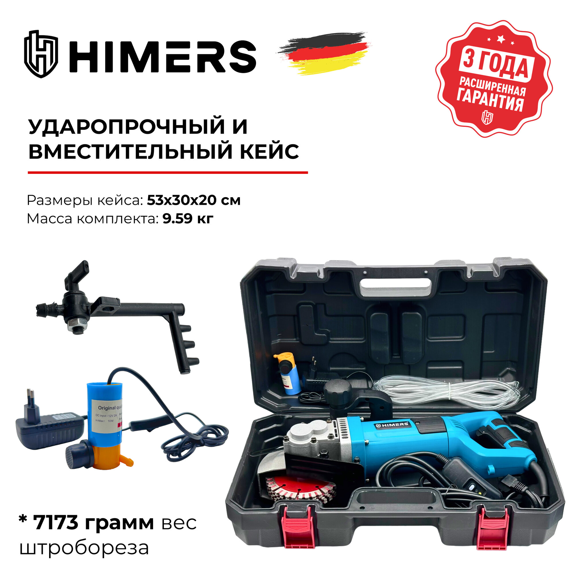 Штроборез HIMERS UM2200R, 2200Вт, 125мм , 8800 об/мин, Кейс, лазер, подключение пылесоса, водяное охлаждение